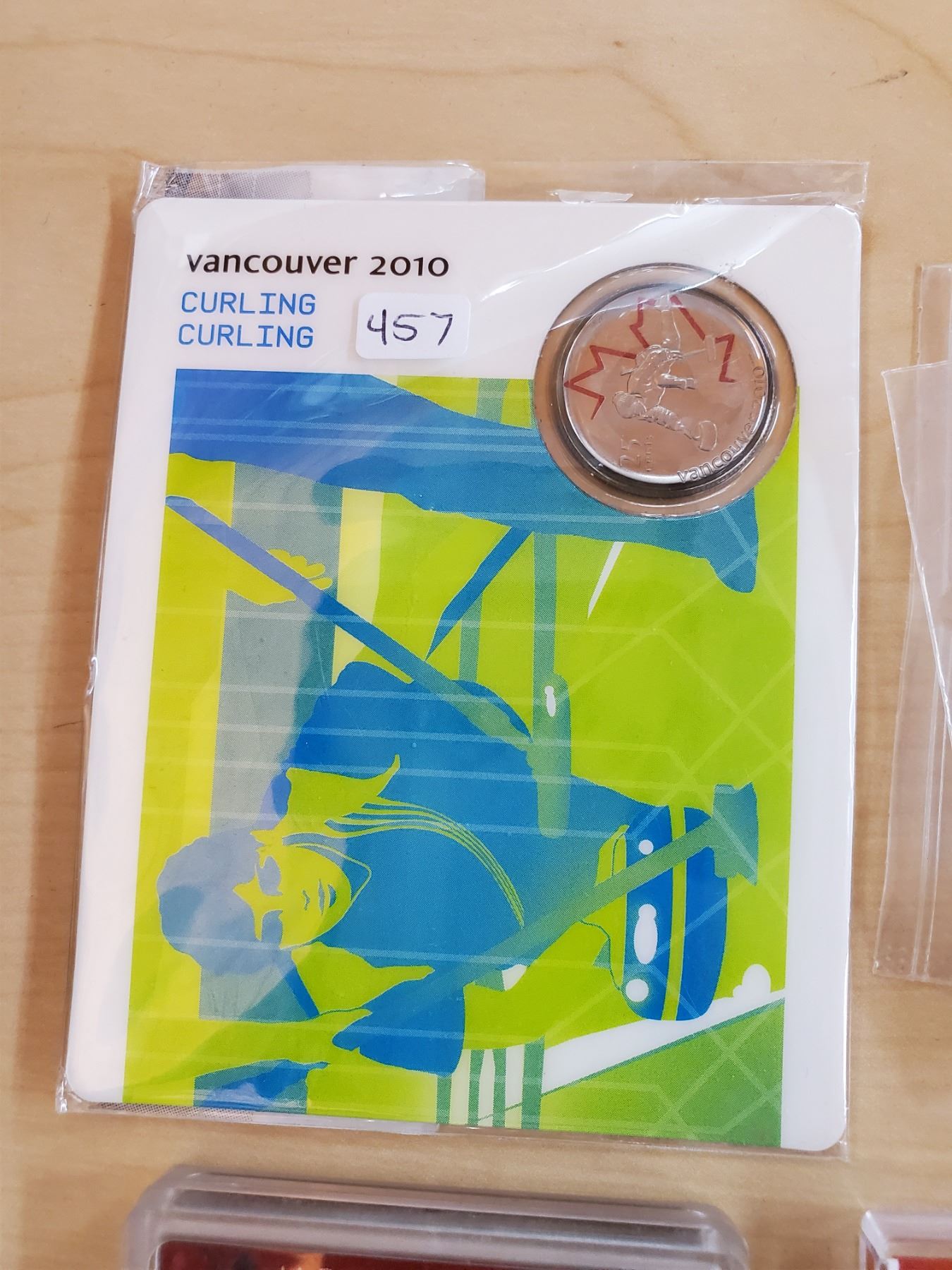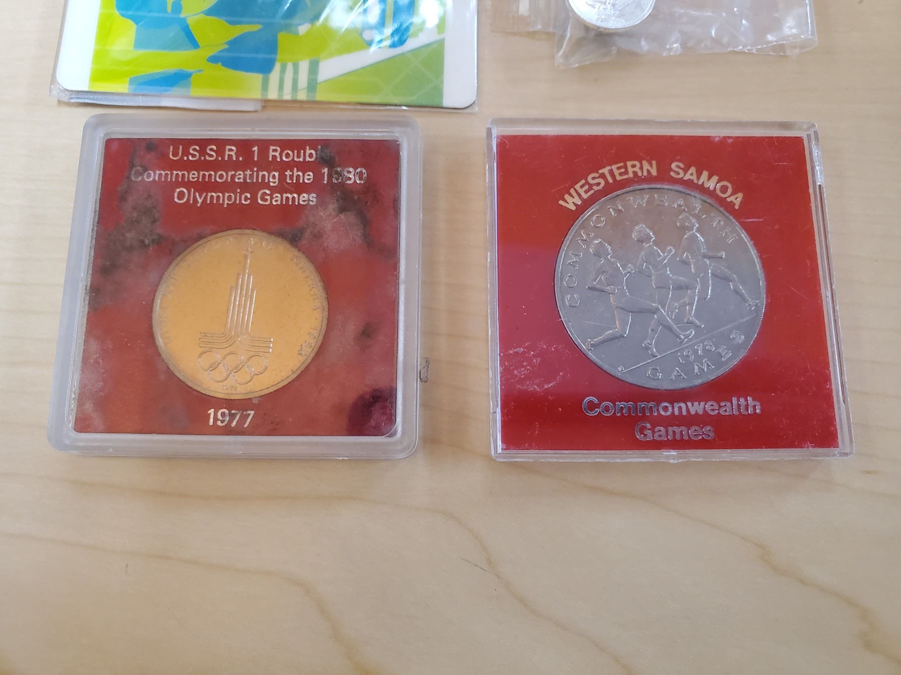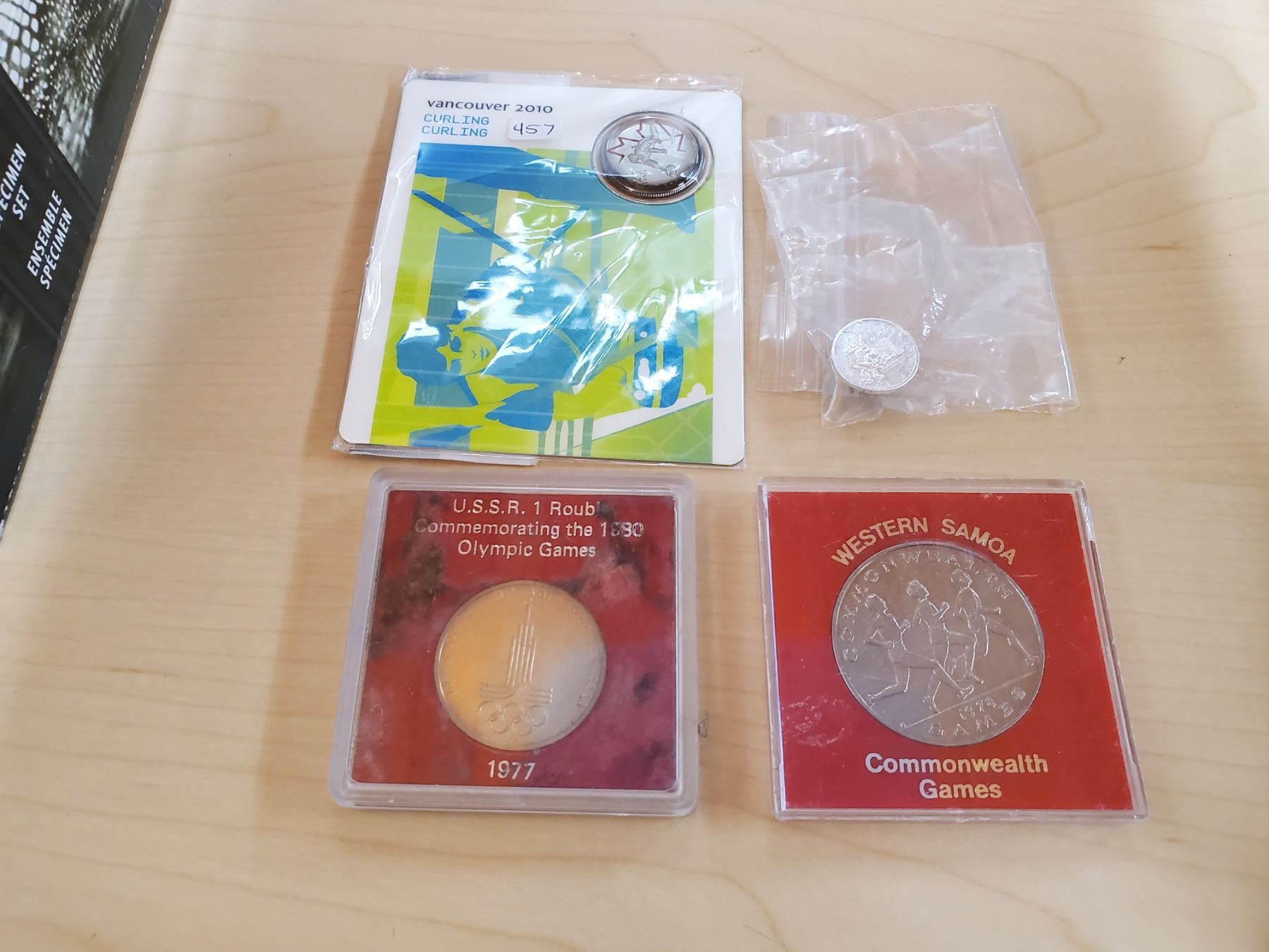 Lot of 4: Vancouver 2010 25¢ sport card, 1972-97 Canada vs Russia pin, Western Samoa Commonwealth Games medallion, 1997 USSR 1 Rouble (1980 Olympics)