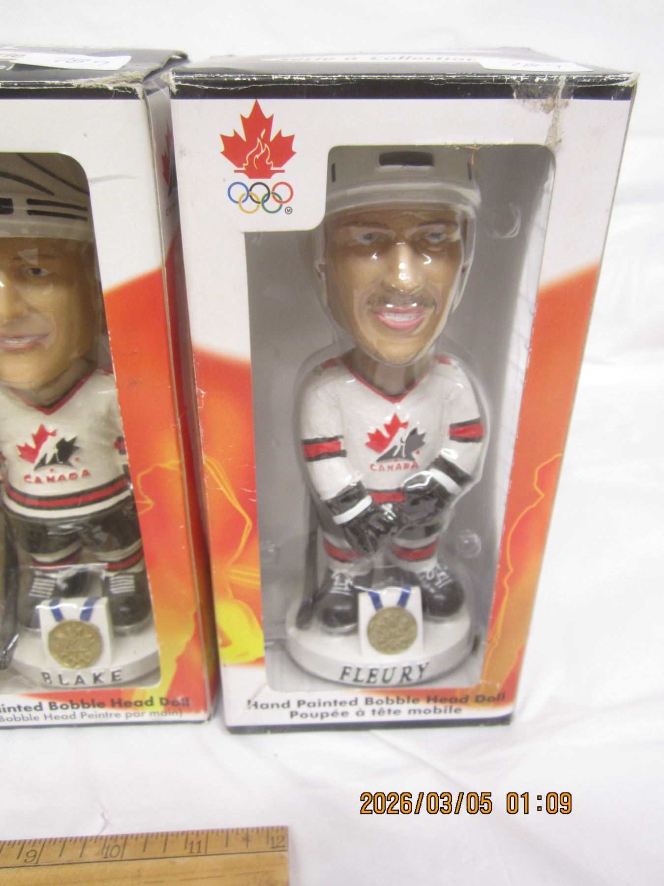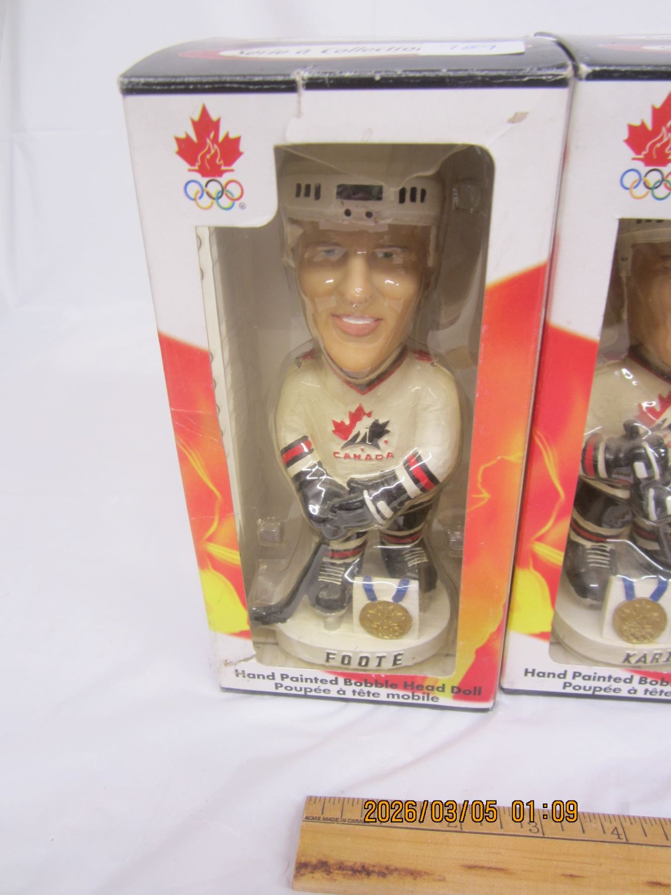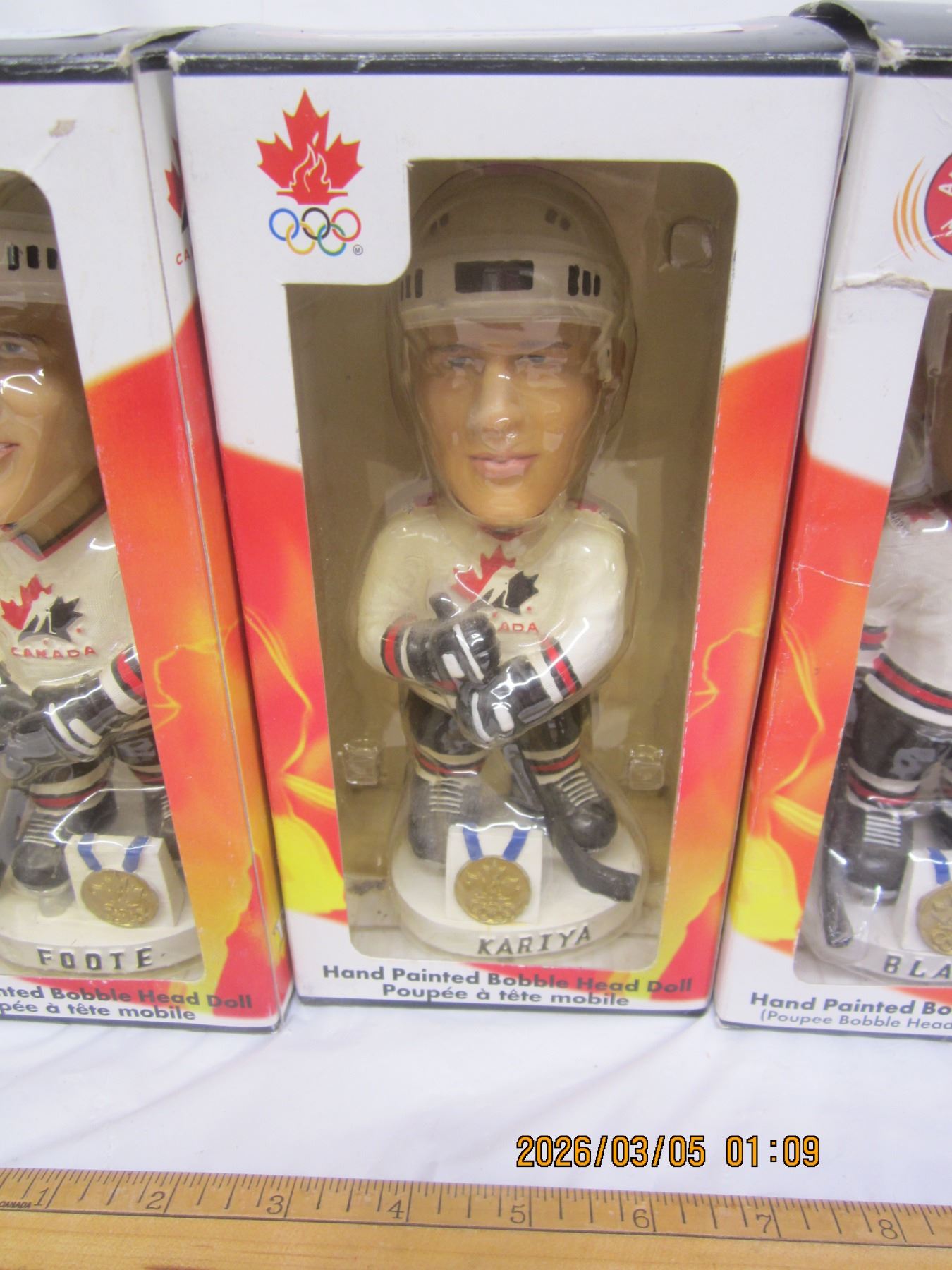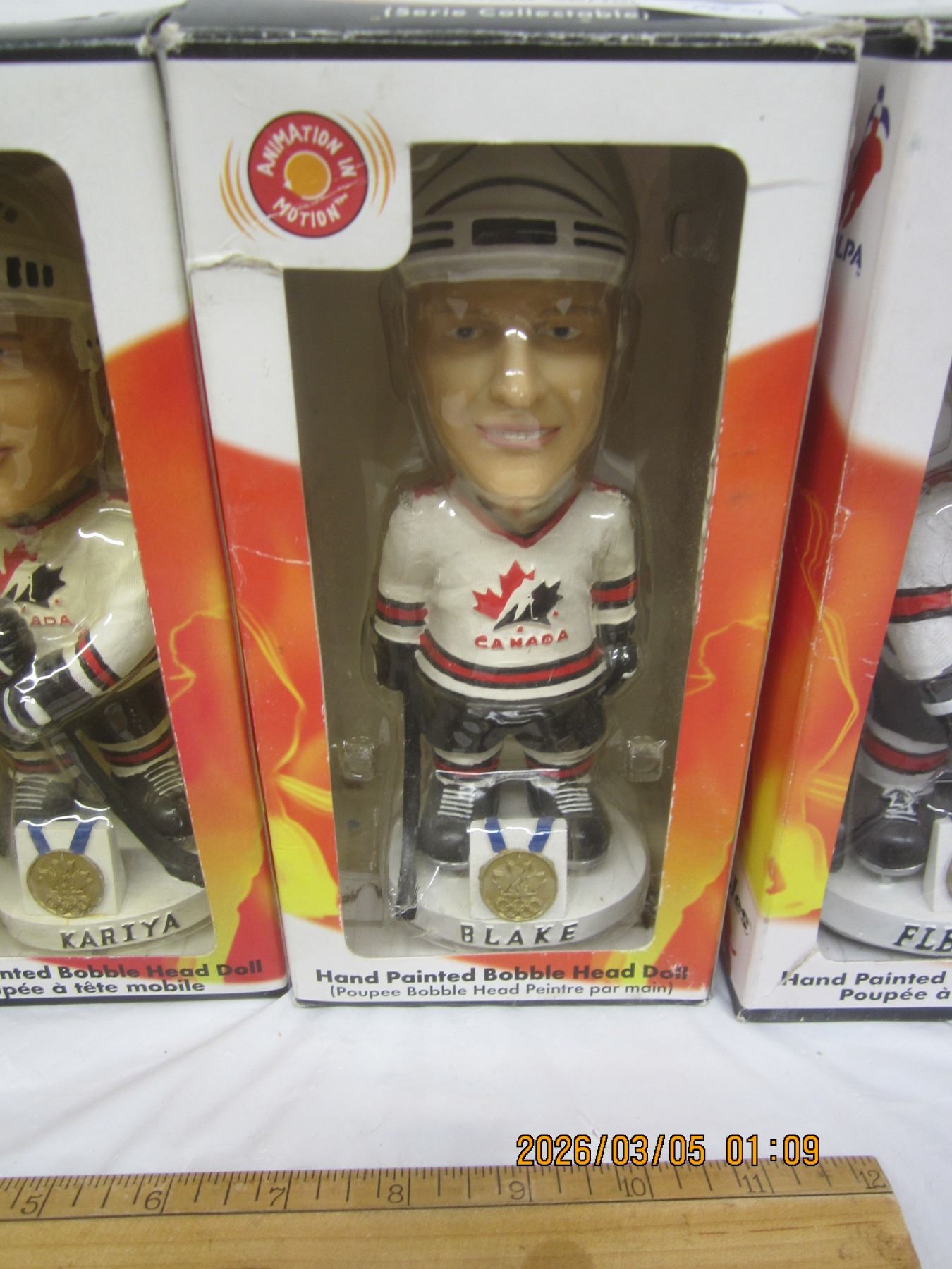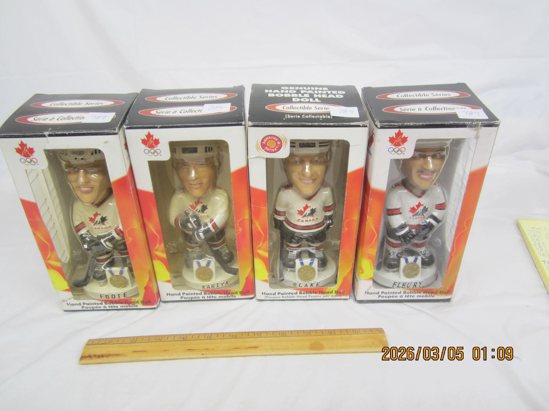 Lot of 4 Vintage Team Canada Hockey Bobble Heads in Box Foote ,Kariya, Blake and Fleury