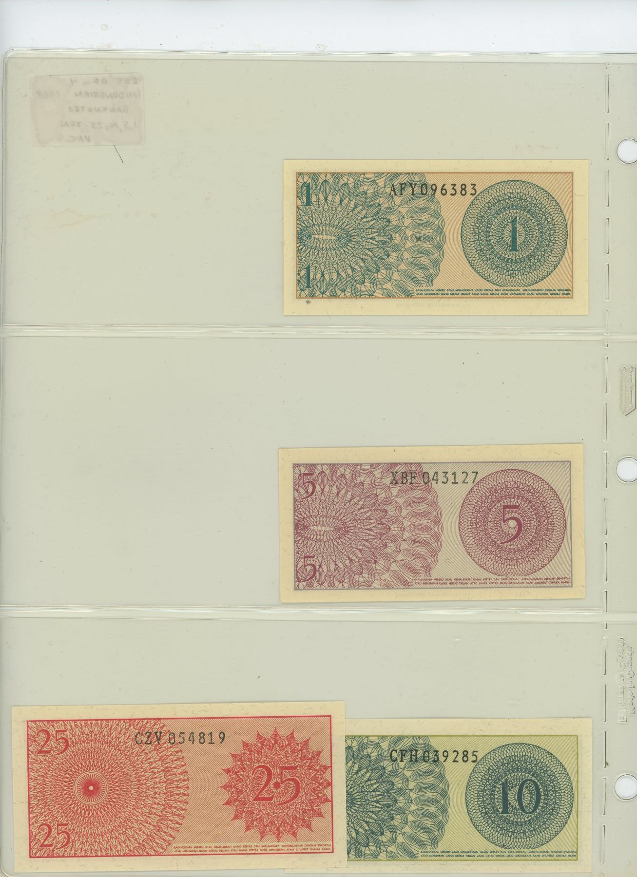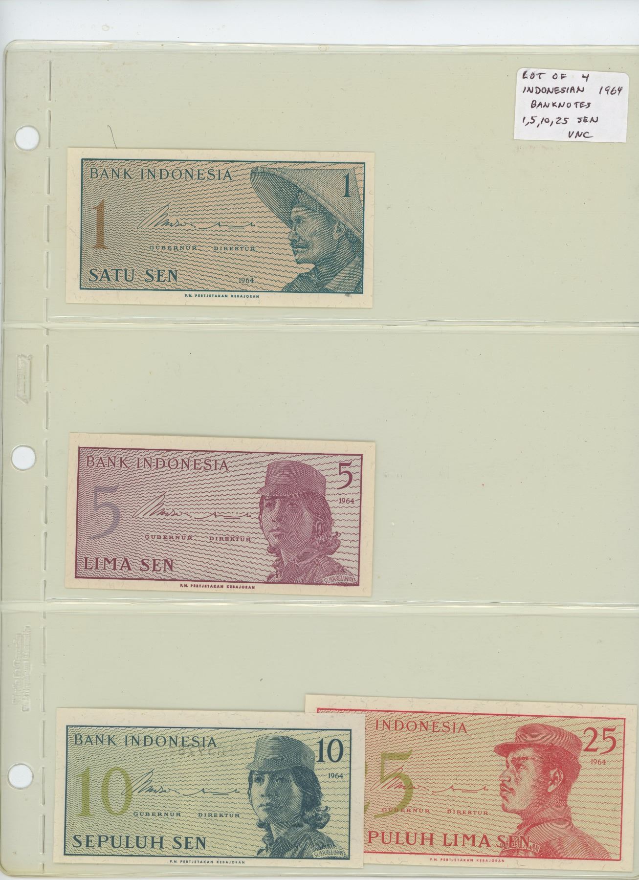 Lot of 4 different Indonesian 1964 notes: 1, 5, 10, 25 Sen. All Unc.