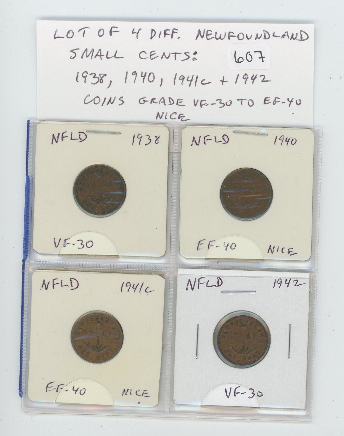 Lot of 4 different Newfoundland Small Cents: 1938, 1940, 1941c & 1942. Coins grade VF-30 to EF-40. Nice.