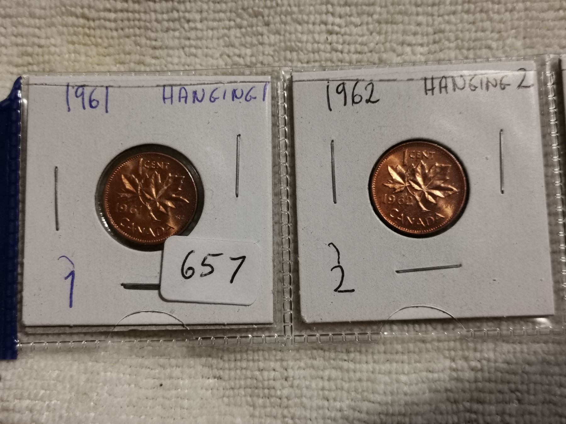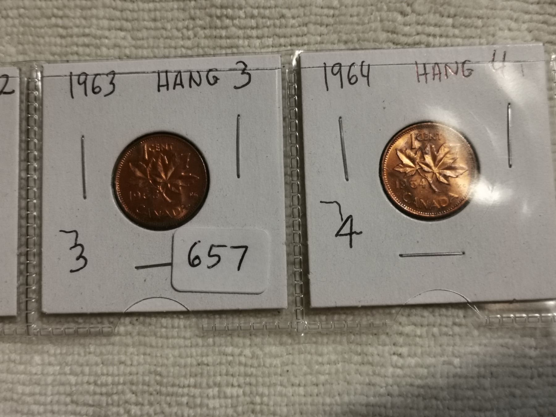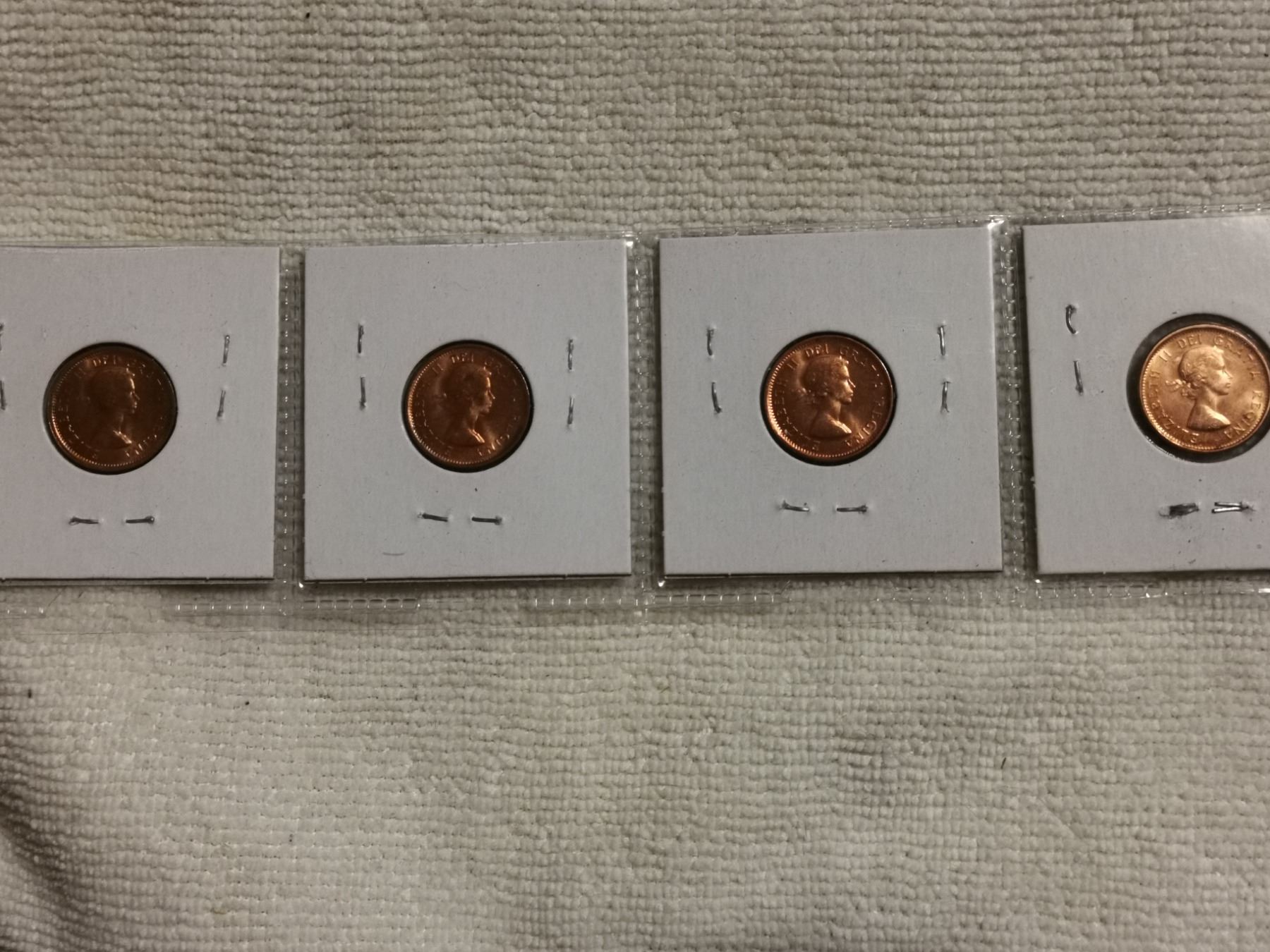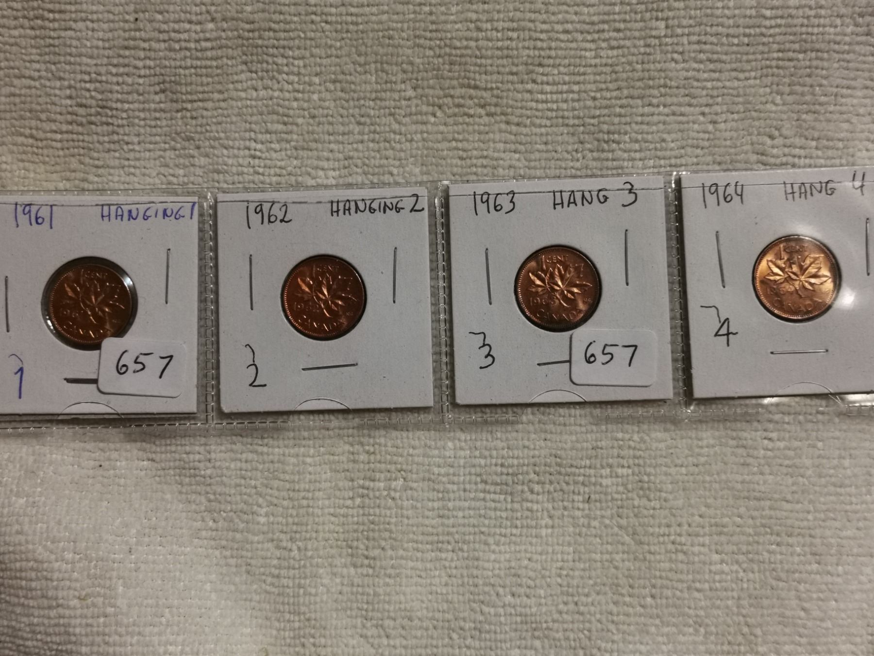 Lot of 4 hanging 1 cent coins, 1961, 62, 63, 64