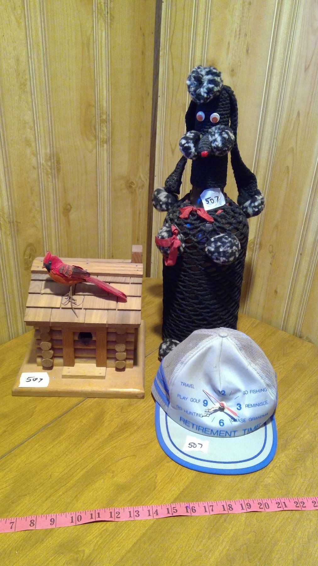 Lot of 4 items (bird house, battery operated retirement hat, 2 crocheted dog bottles)