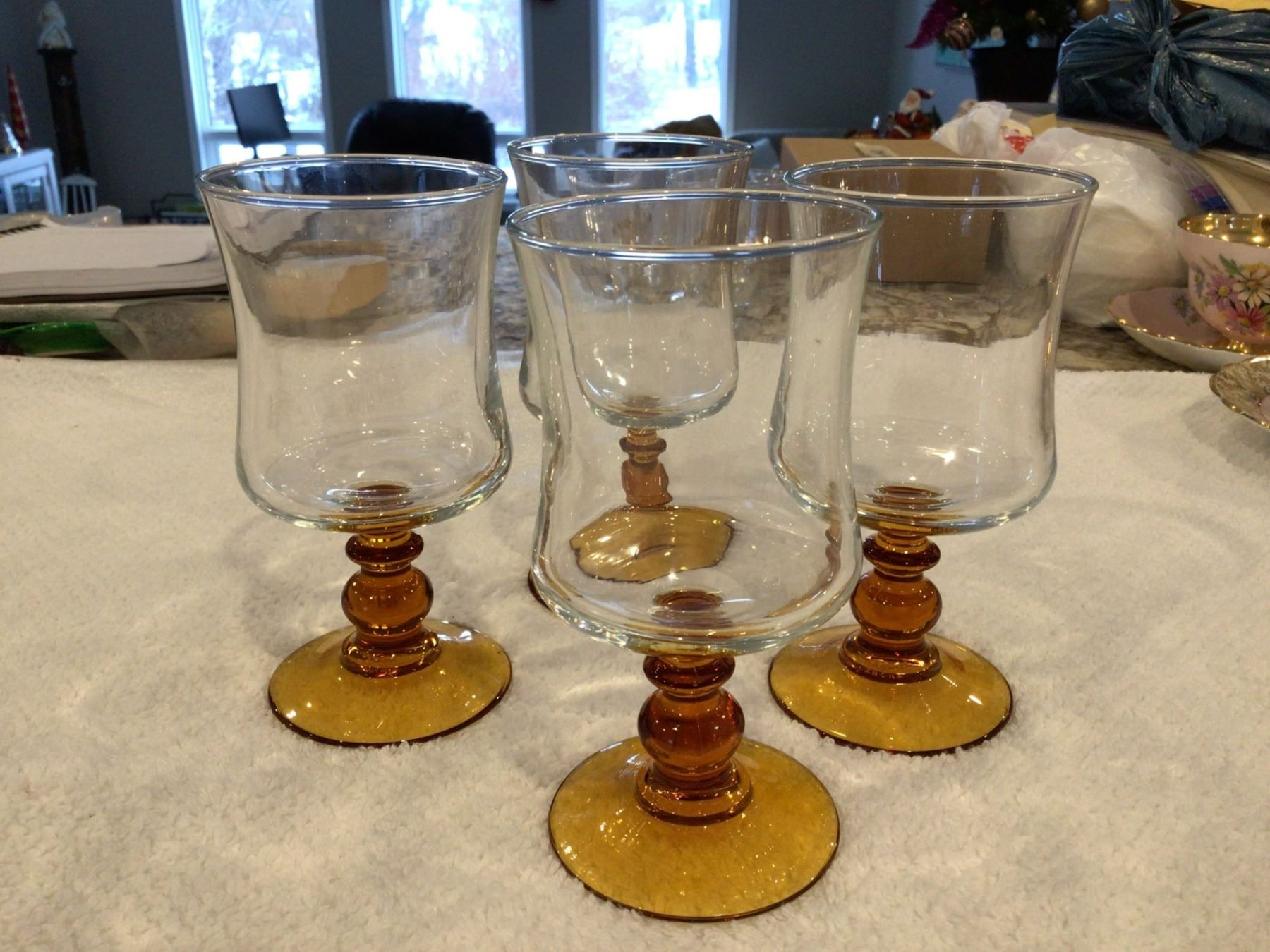 Lot of 4 vintage 5" tall amber stemmed small wine/water/aperitif glasses. Stamped "France"