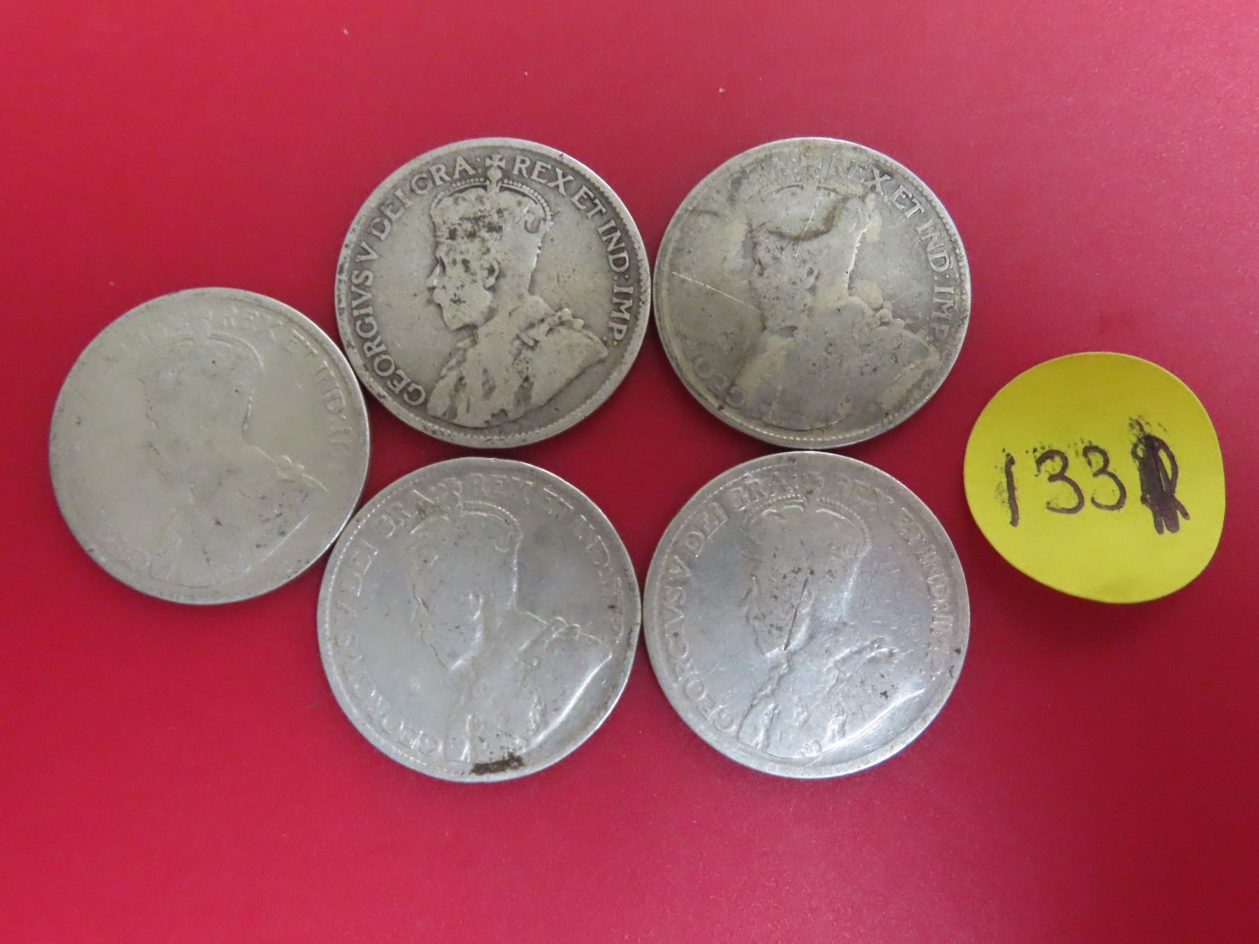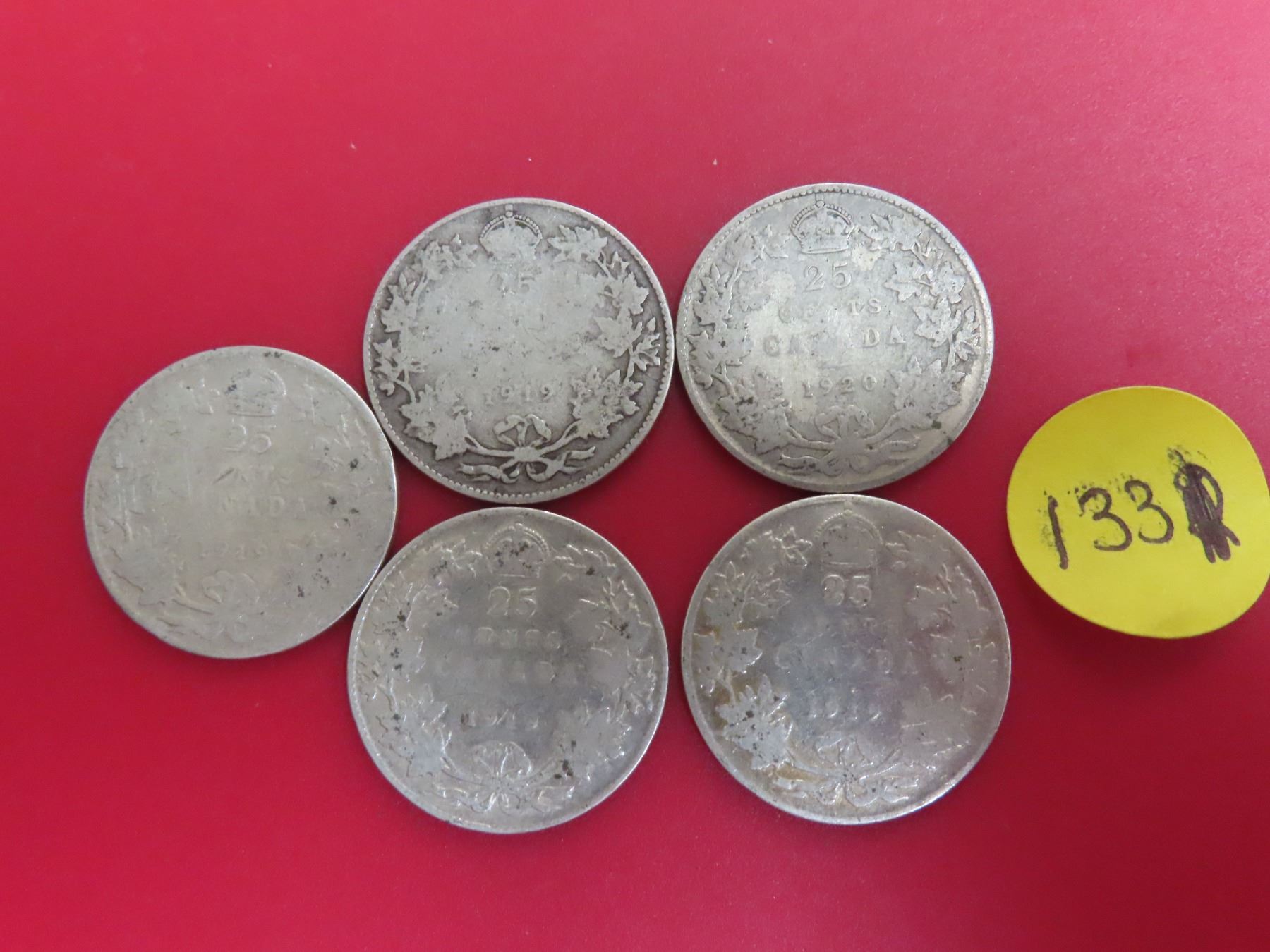 Lot of 5 (4-1919 and 1920) canadian silver 25 cent coins