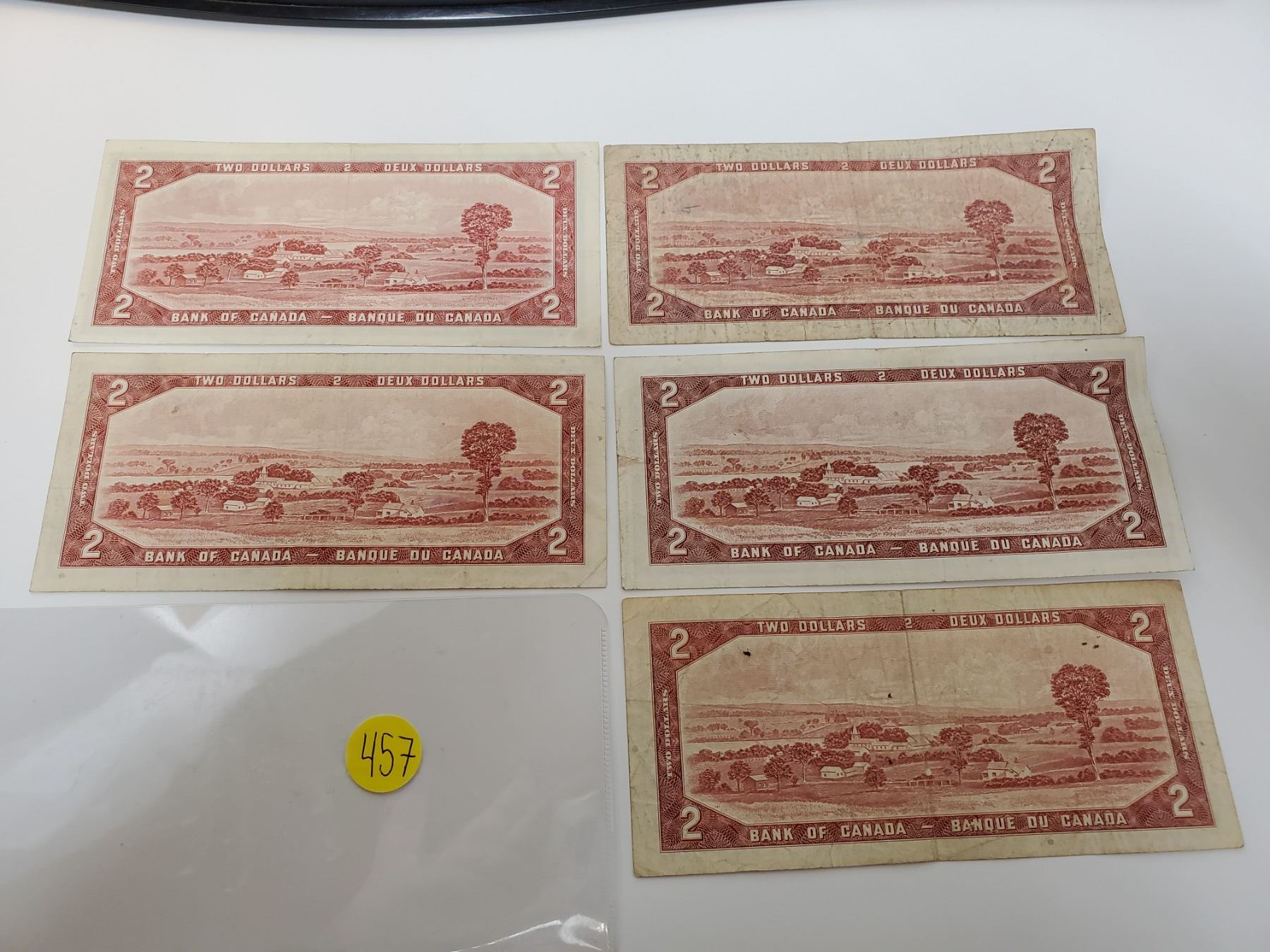 Lot of 5 Canada 2 dollar 1954 Bank of Canada $2 bills Circulated