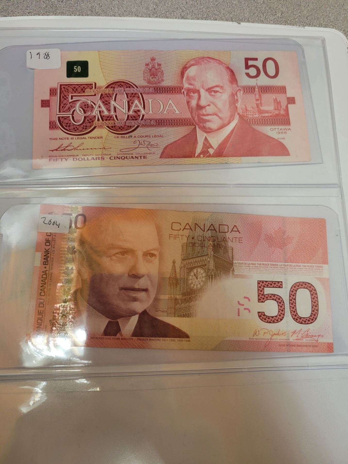 Lot of 5 Canadian $50.00 bills - 1937, 1954, 1975, 1988, 2004