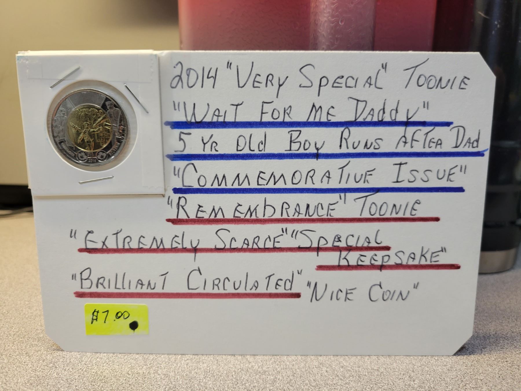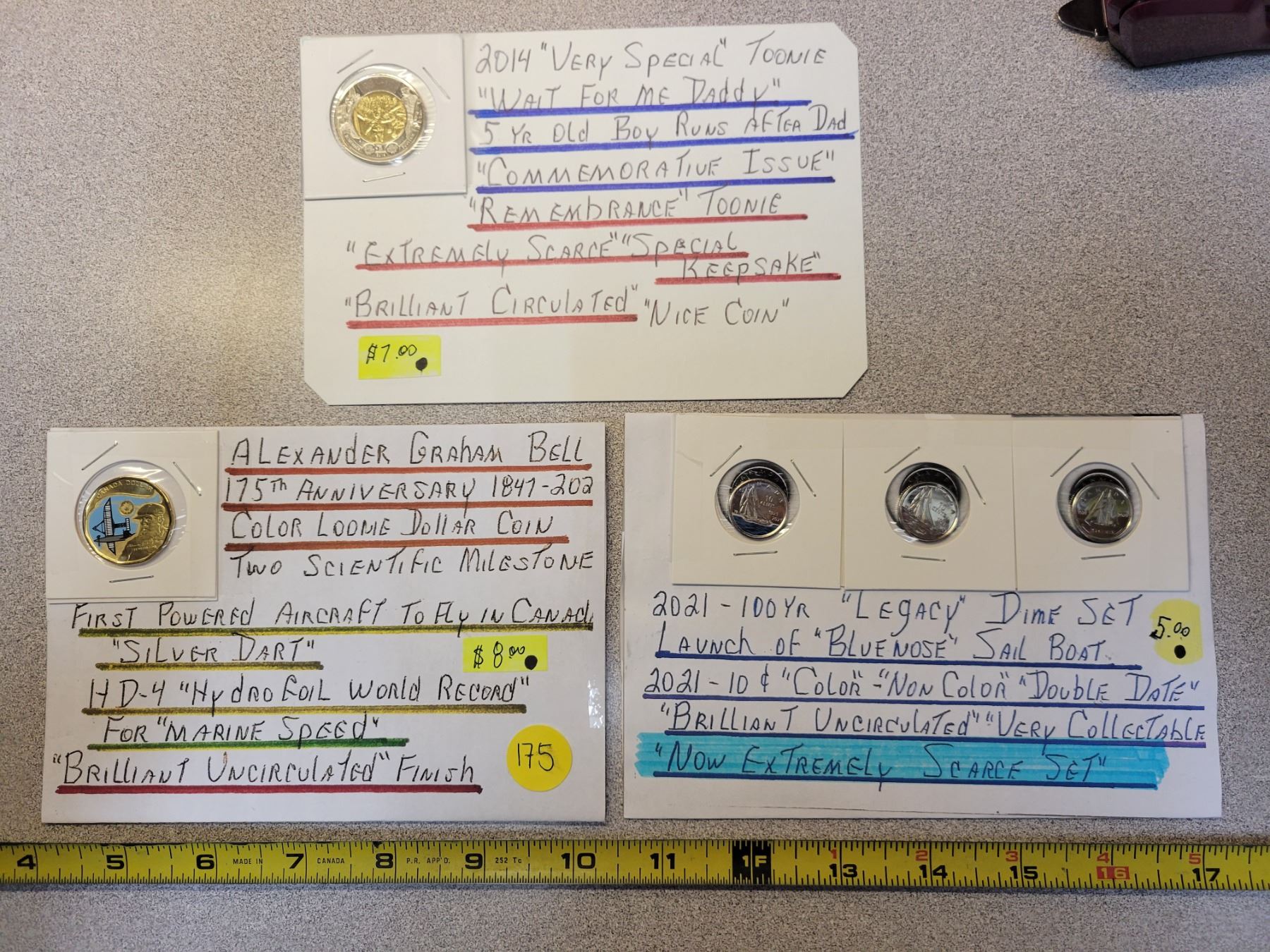 Lot of 5 collectible coins - 2014 'Wait for me daddy' Remembrance Day toonie $2.00, 17th Ann. Alexander Graham Bell colorized loonie $1.00 & 100 year legacy three piece dime set - Launch of 'Bluenose' sail boat