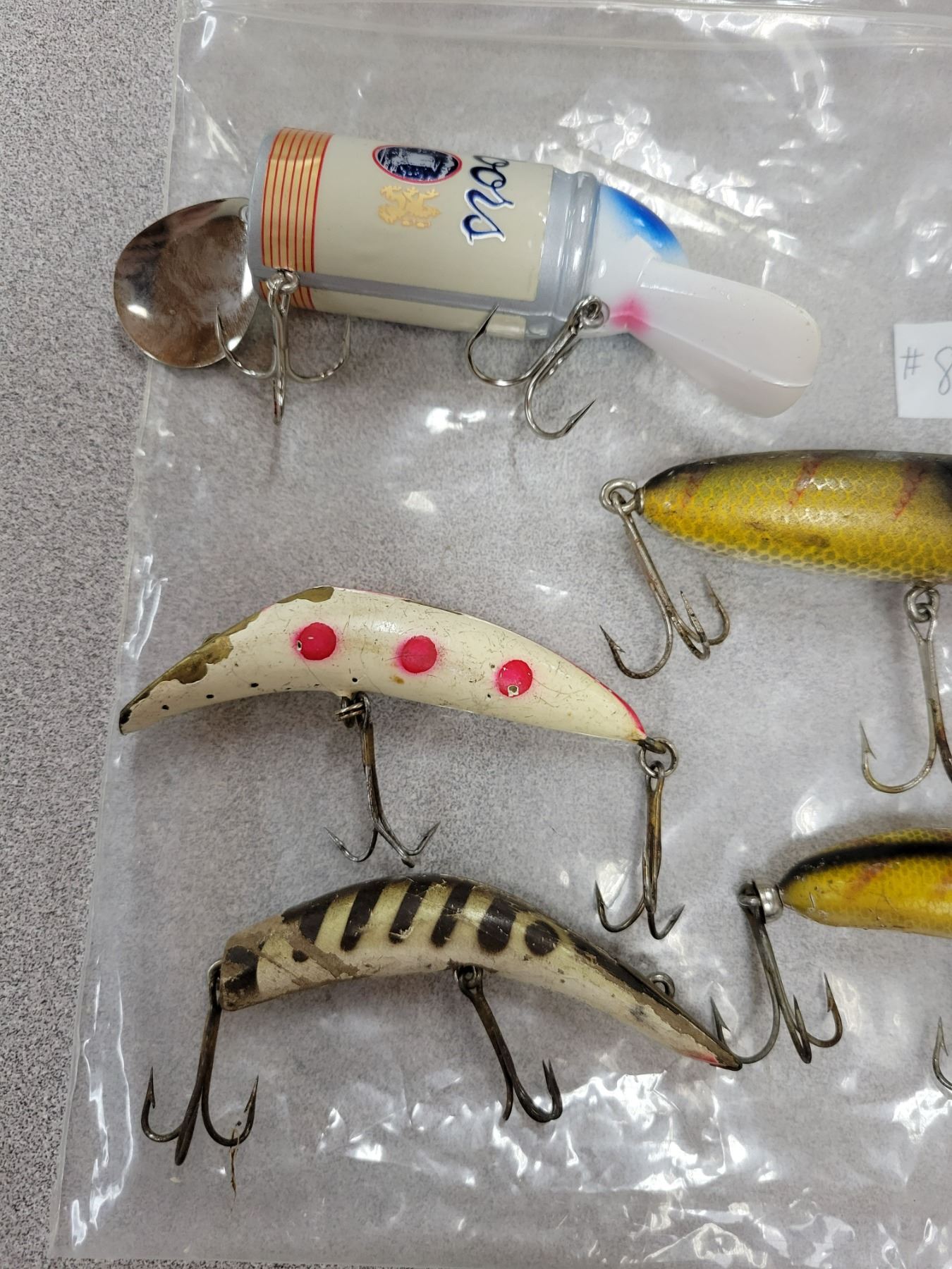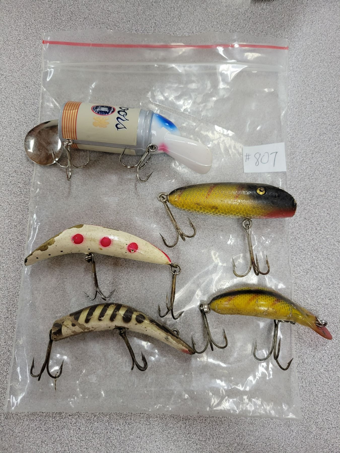 Lot of 5 fishing lures, three wood