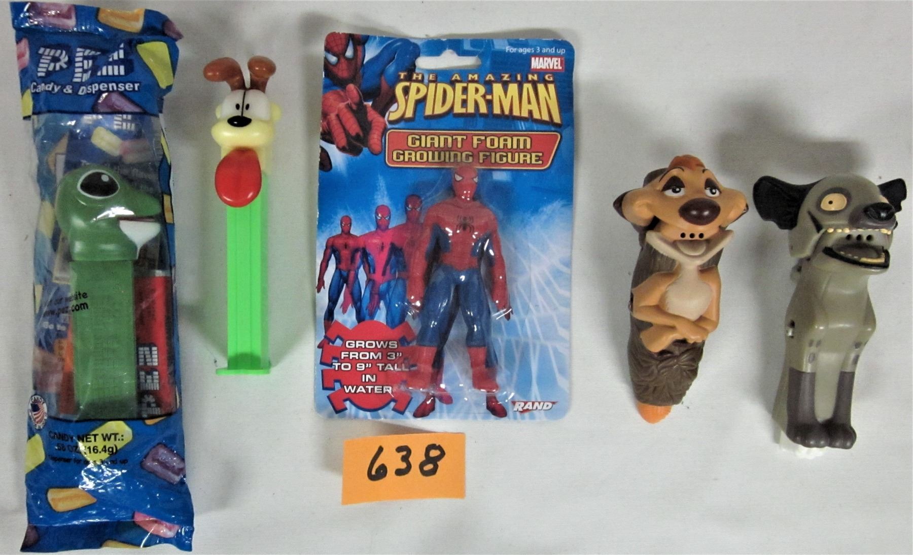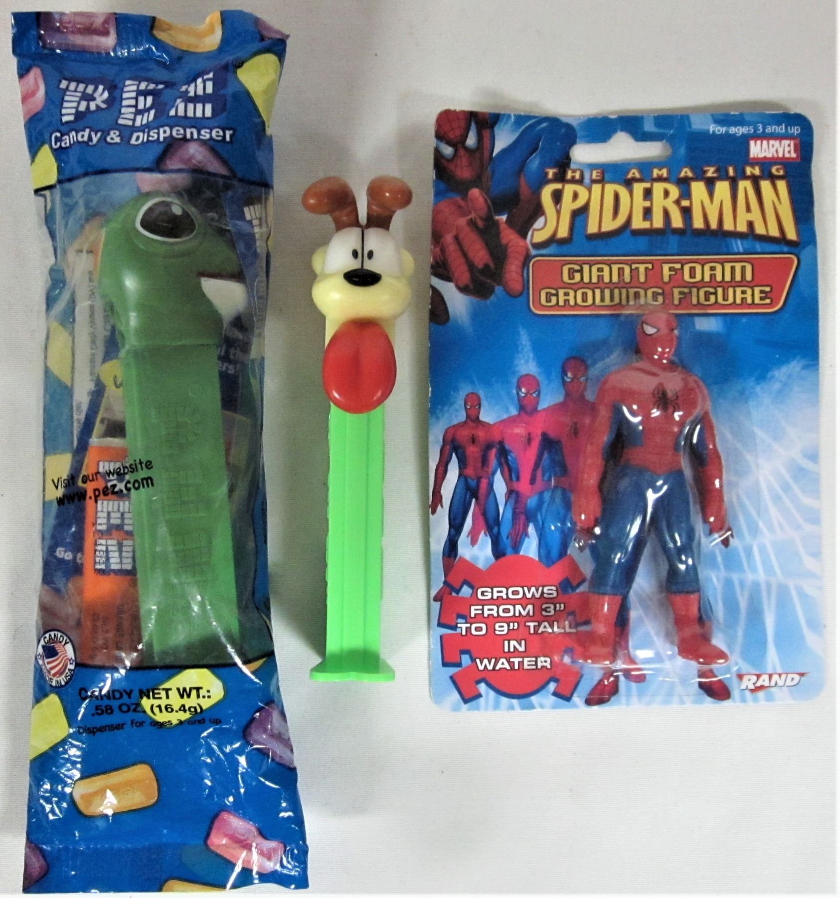 Lot of 5 vintage collectible toys - New "Geicko" pez - Garfield Odie pez, new giant Spiderman figure & 2 McDonalds finger rings