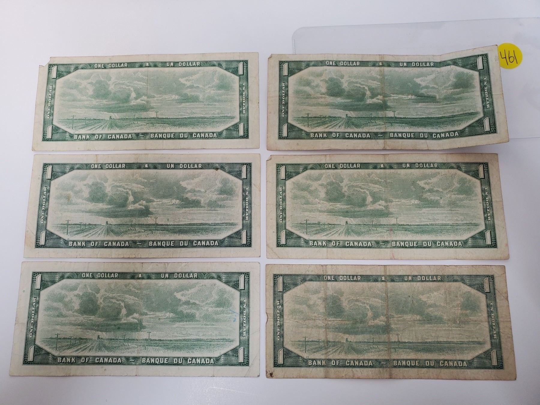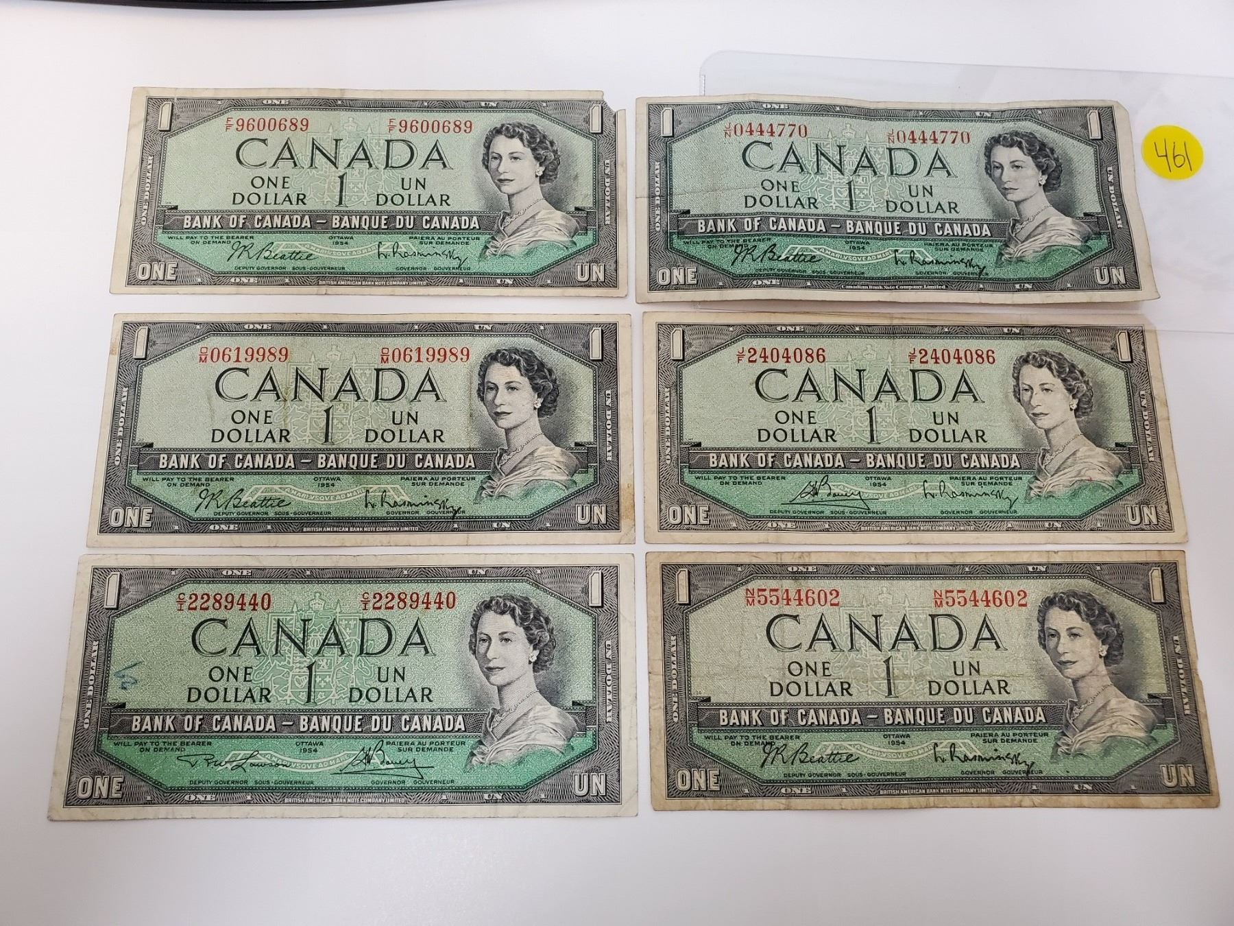 Lot of 6 Canada 1 Dollar 1954 Bank of Canada $1 bills