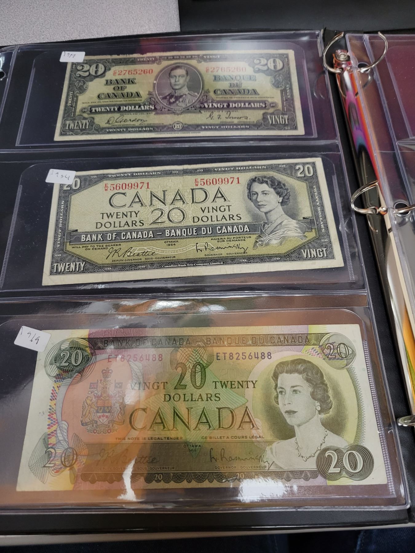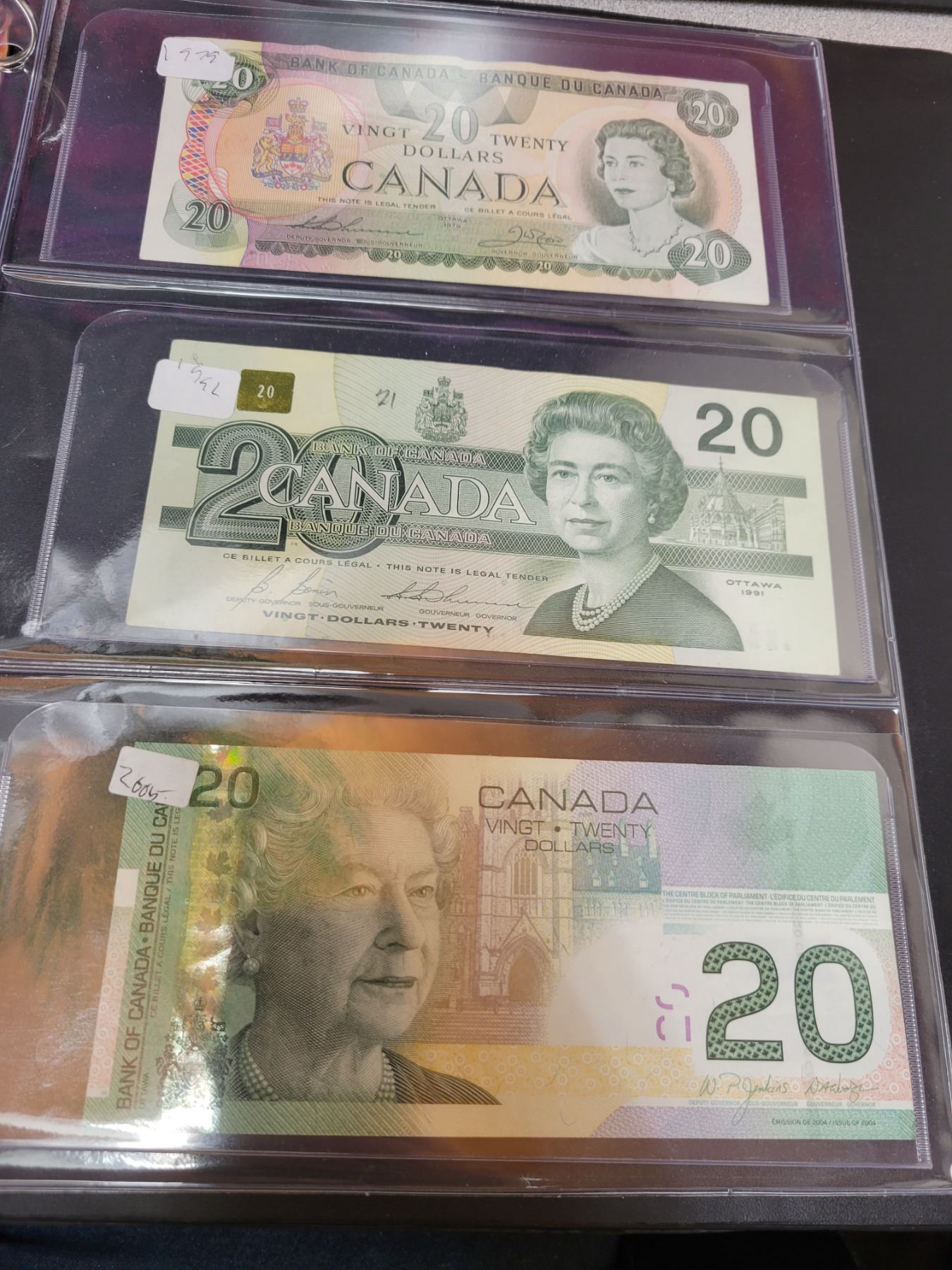 Lot of 6 Canadian $20.00 bills - 1937, 1954, 1969, 1979, 1991, 2004