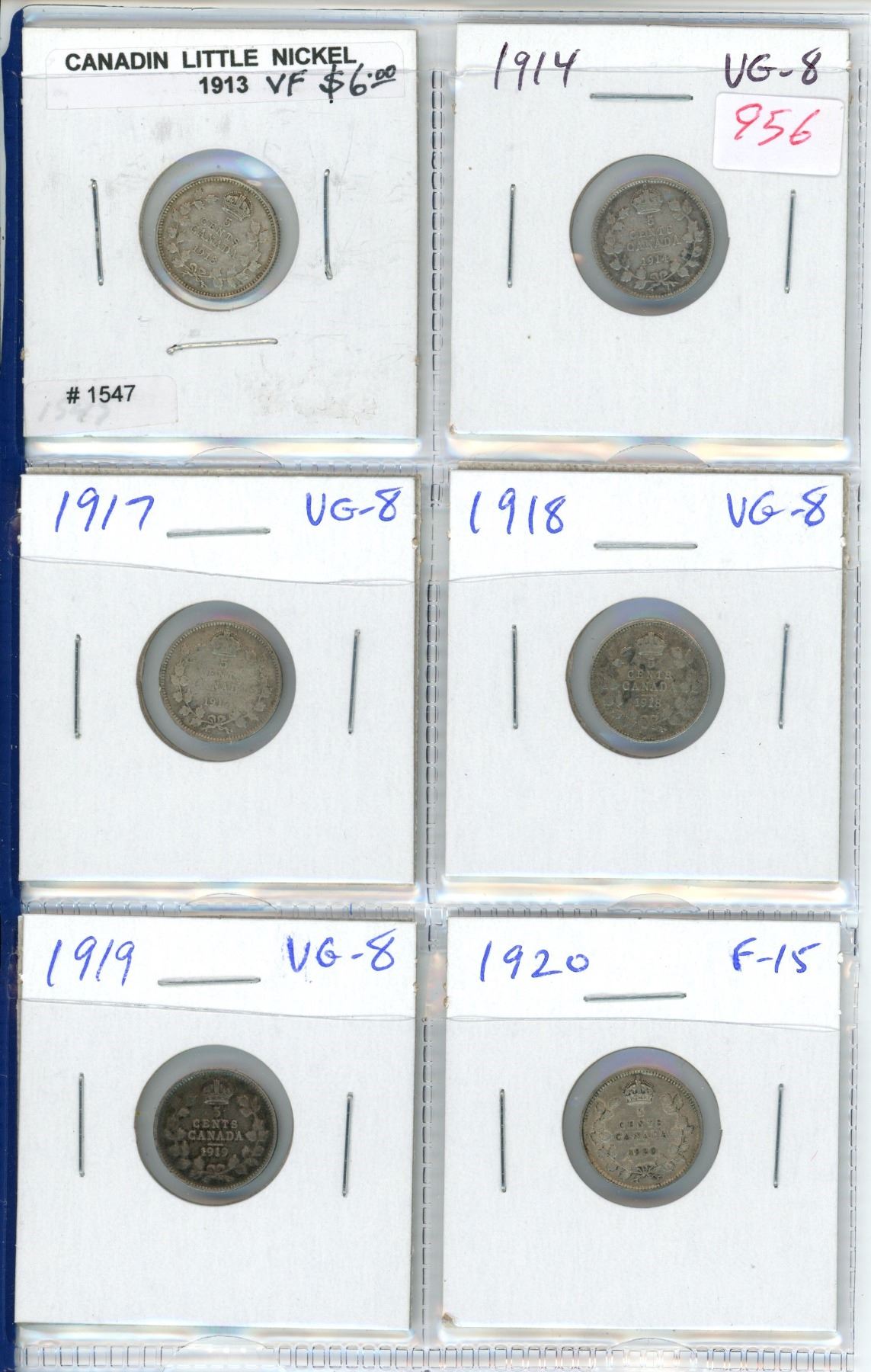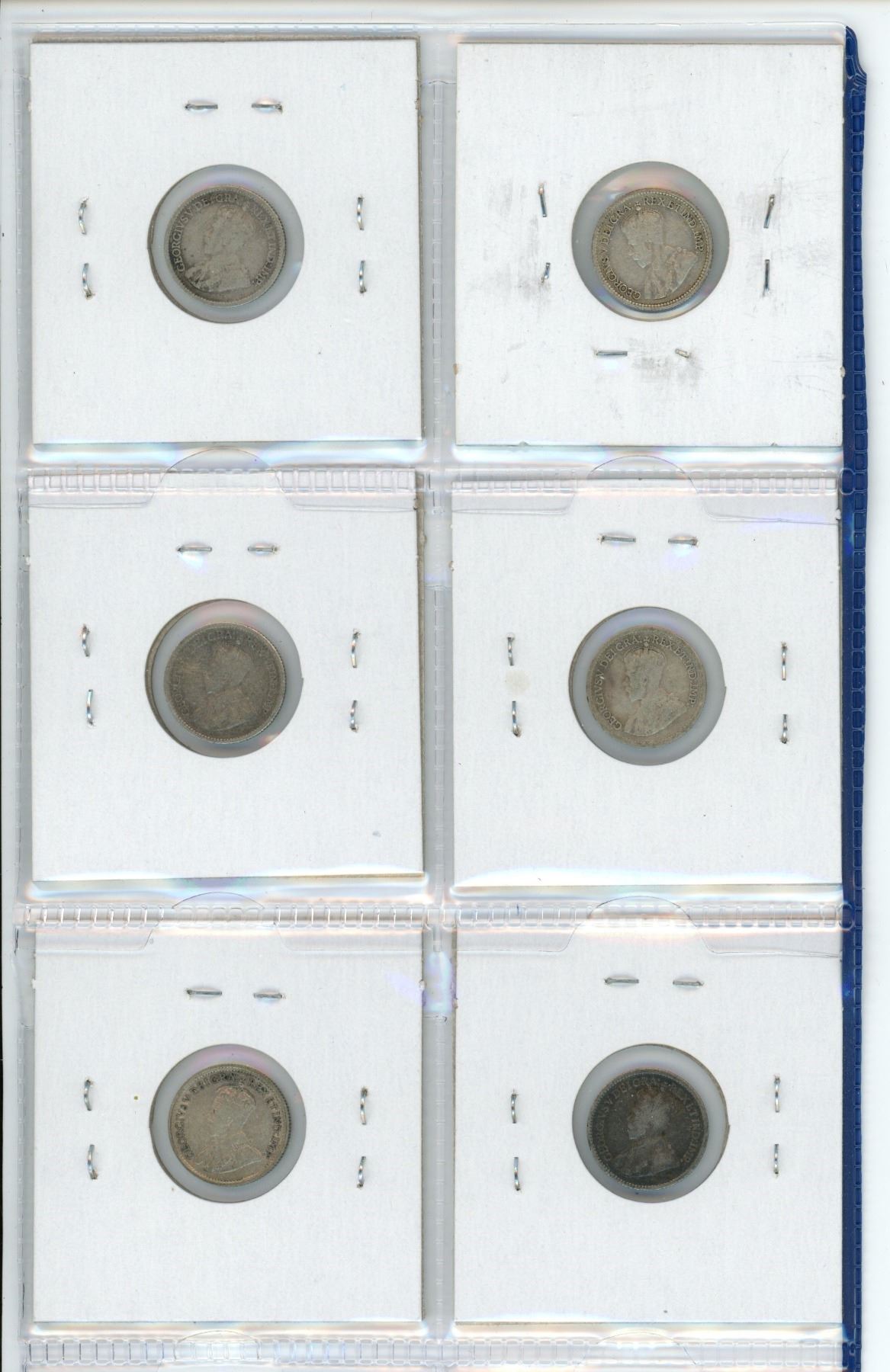Lot of 6 Canadian George V Silver 5 Cents. Includes 1913, 1914, 1917, 1918, 1919 & 1920. Coins grade VG-8 to VF-20.