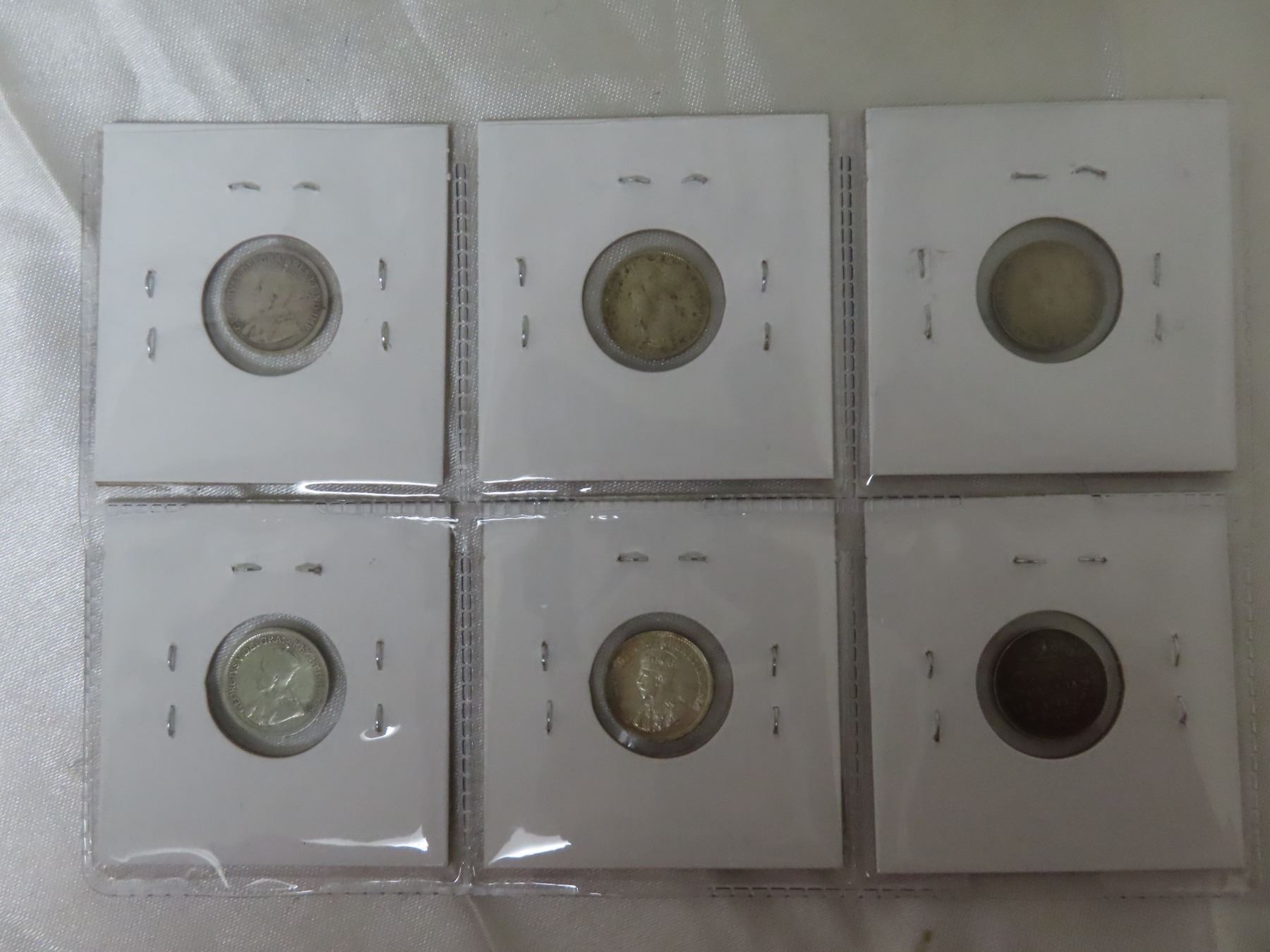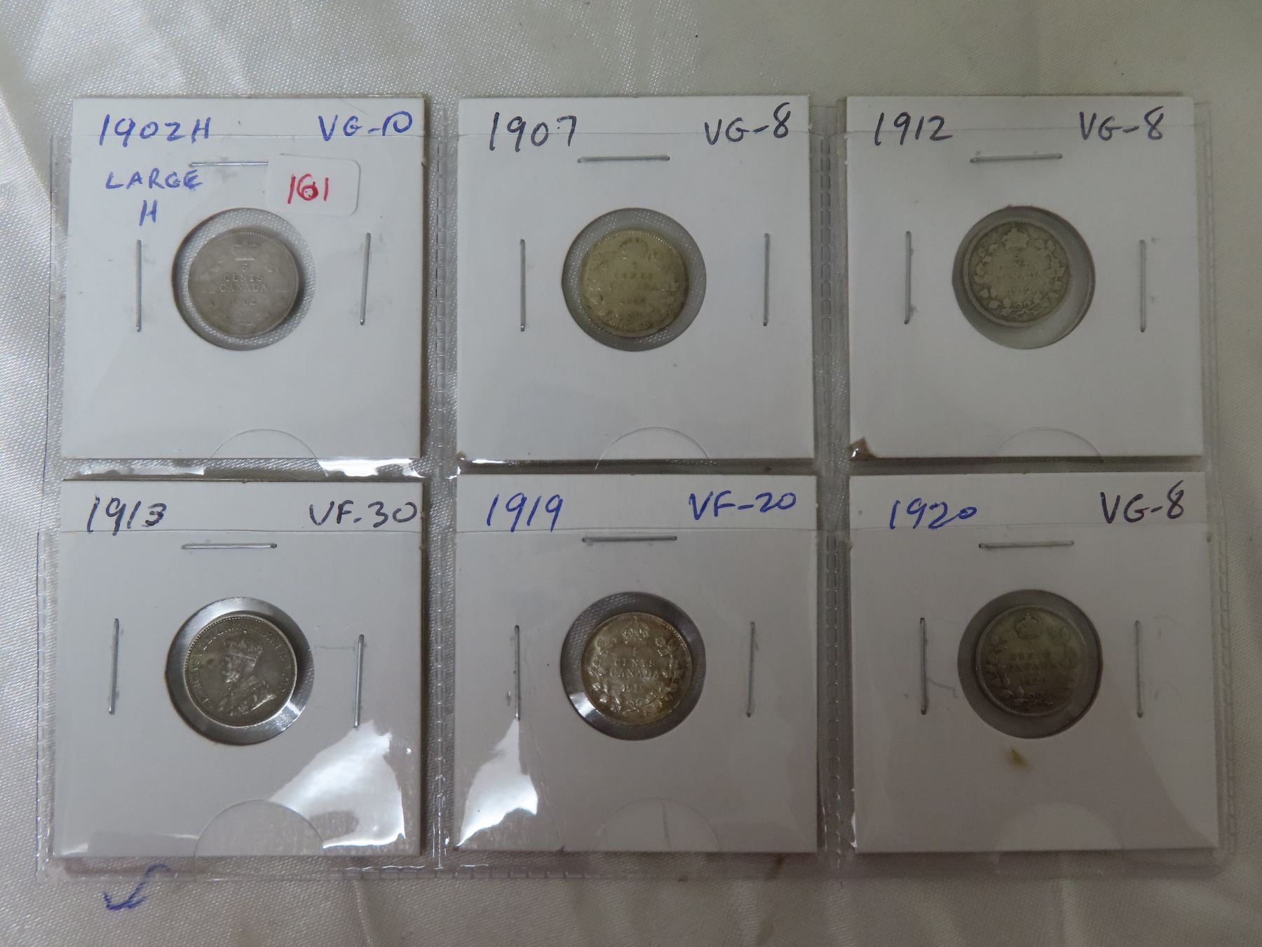 Lot of 6 Canadian Silver 5 Cents. Dates include 1902H Large H, 1907, 1912, 1913, 1919 & 1920. Coins