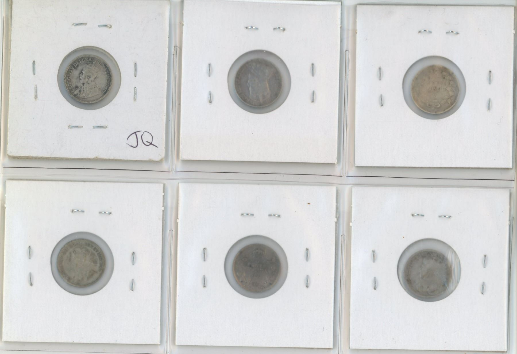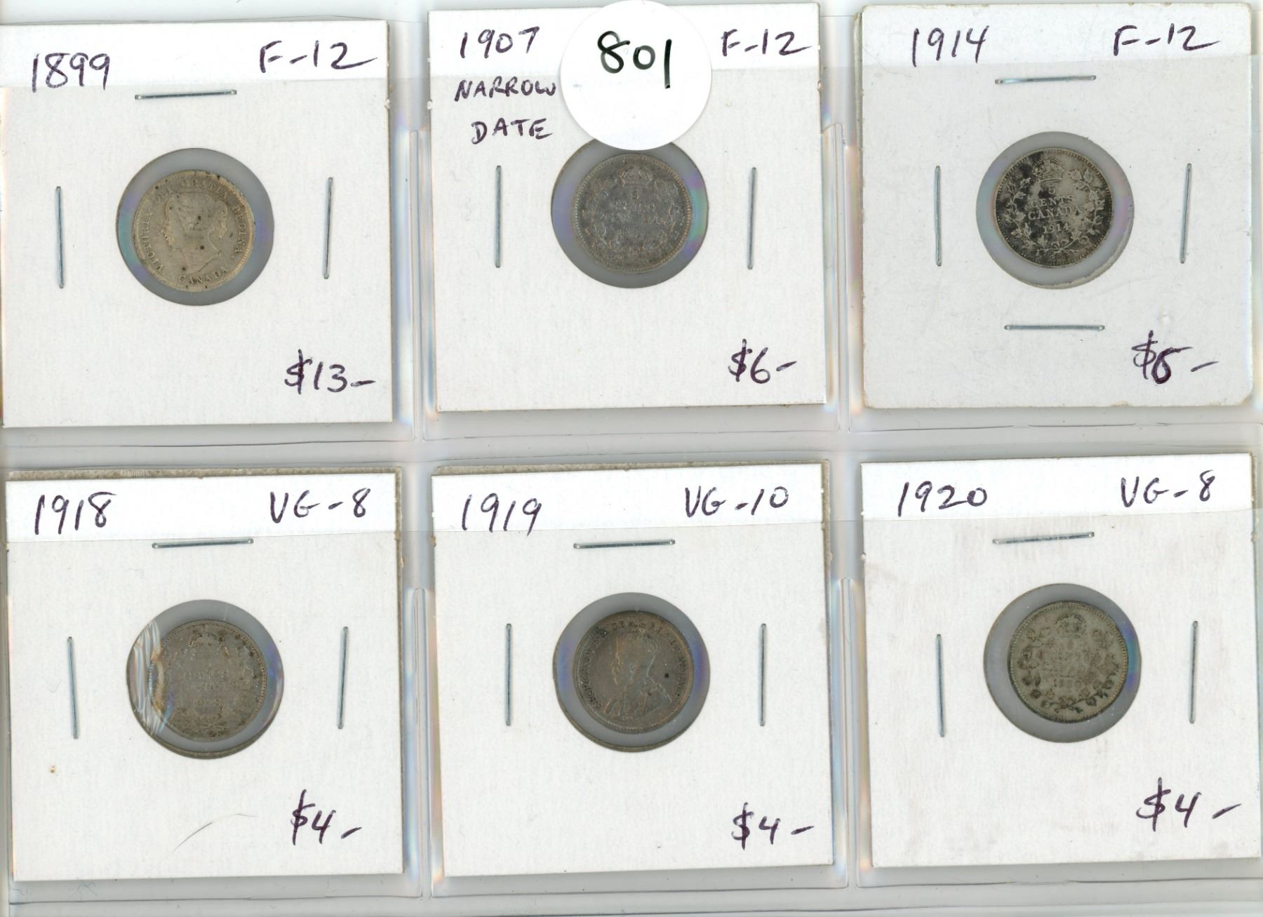 Lot of 6 Canadian Silver 5 Cents. Includes 1899, 1907 Narrow Date, 1914, 1918, 1919 & 1920. Coins grade VG-8 to F-12.