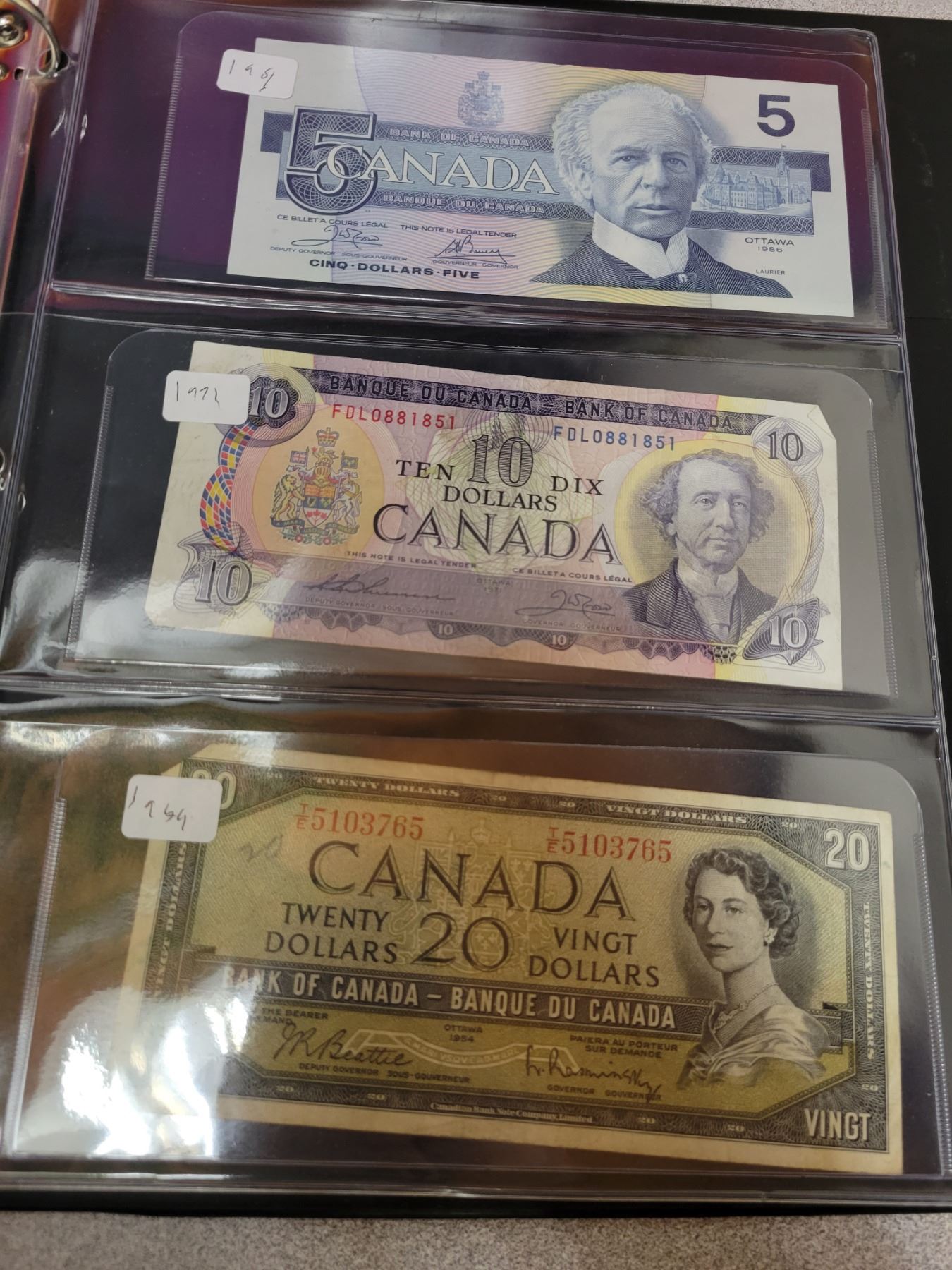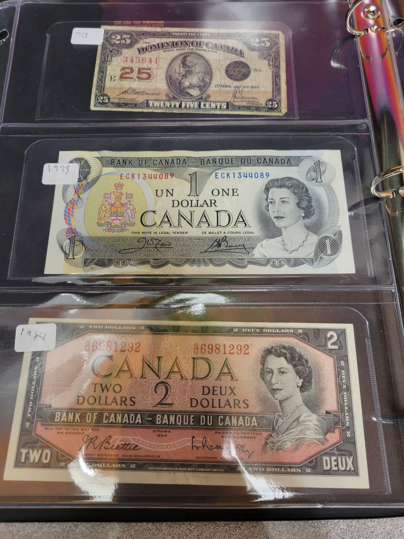 Lot of 6 Canadian bills - 1923 25¢ shinplaster, 1973 $1.00, 1954 $2.00, 1986 $5.00, 1971 $10.00, 1954 $20.00