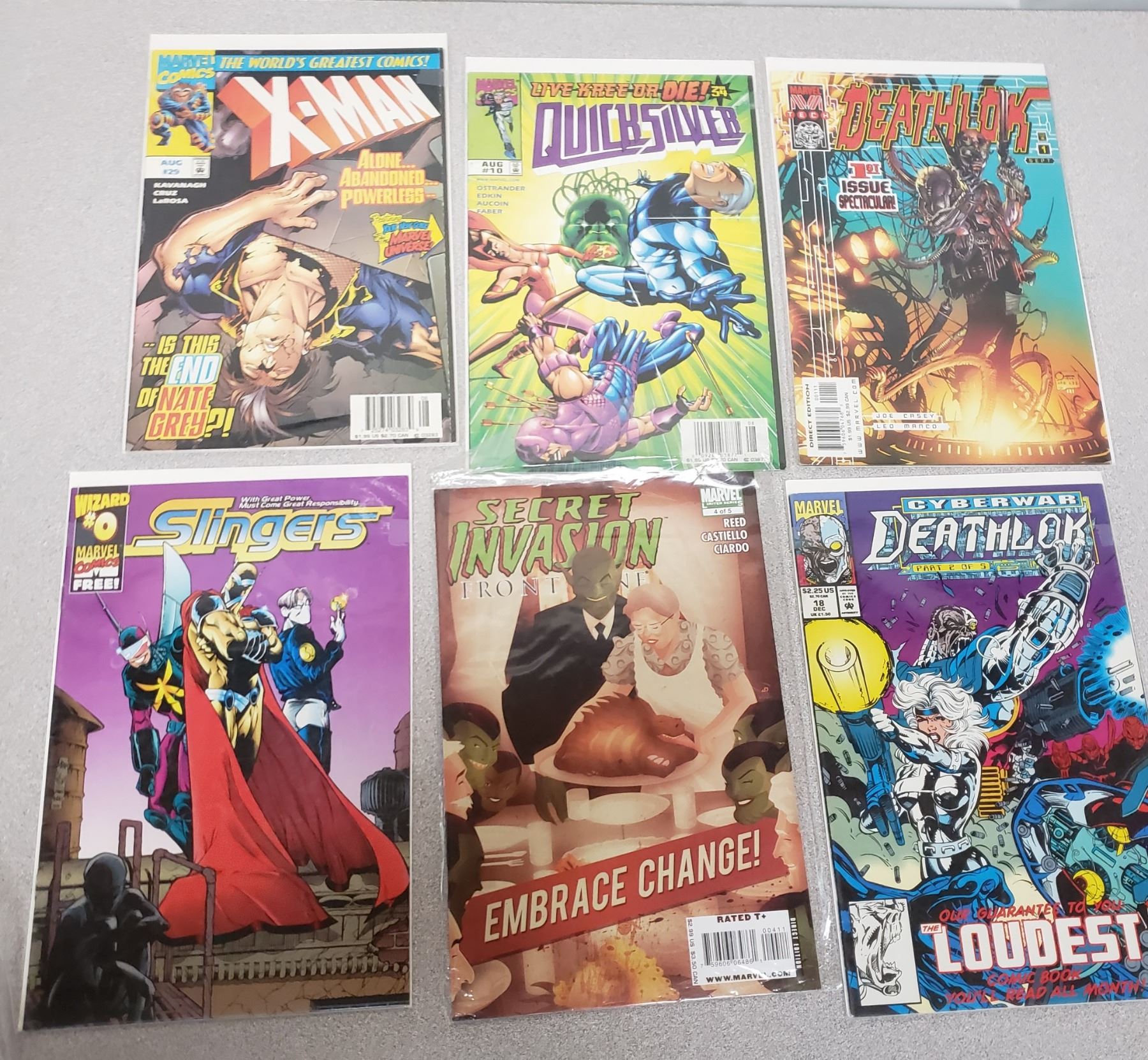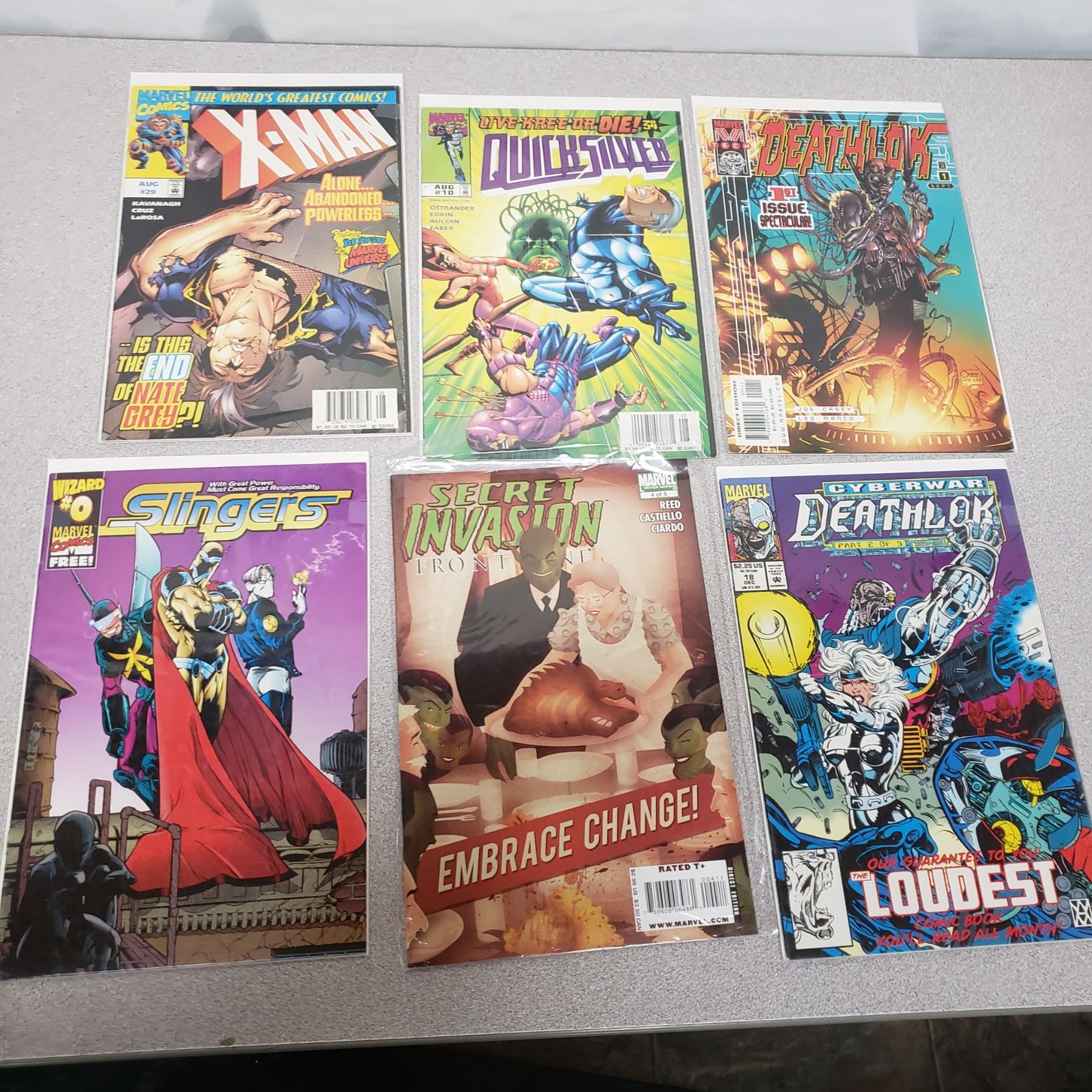 Deathlok #1 and #18, Quicksilver #10, X-Man #29, Slingers #0 and Secret Invasion #4 of 5. Comics bagged,boarded and in MINT Condition