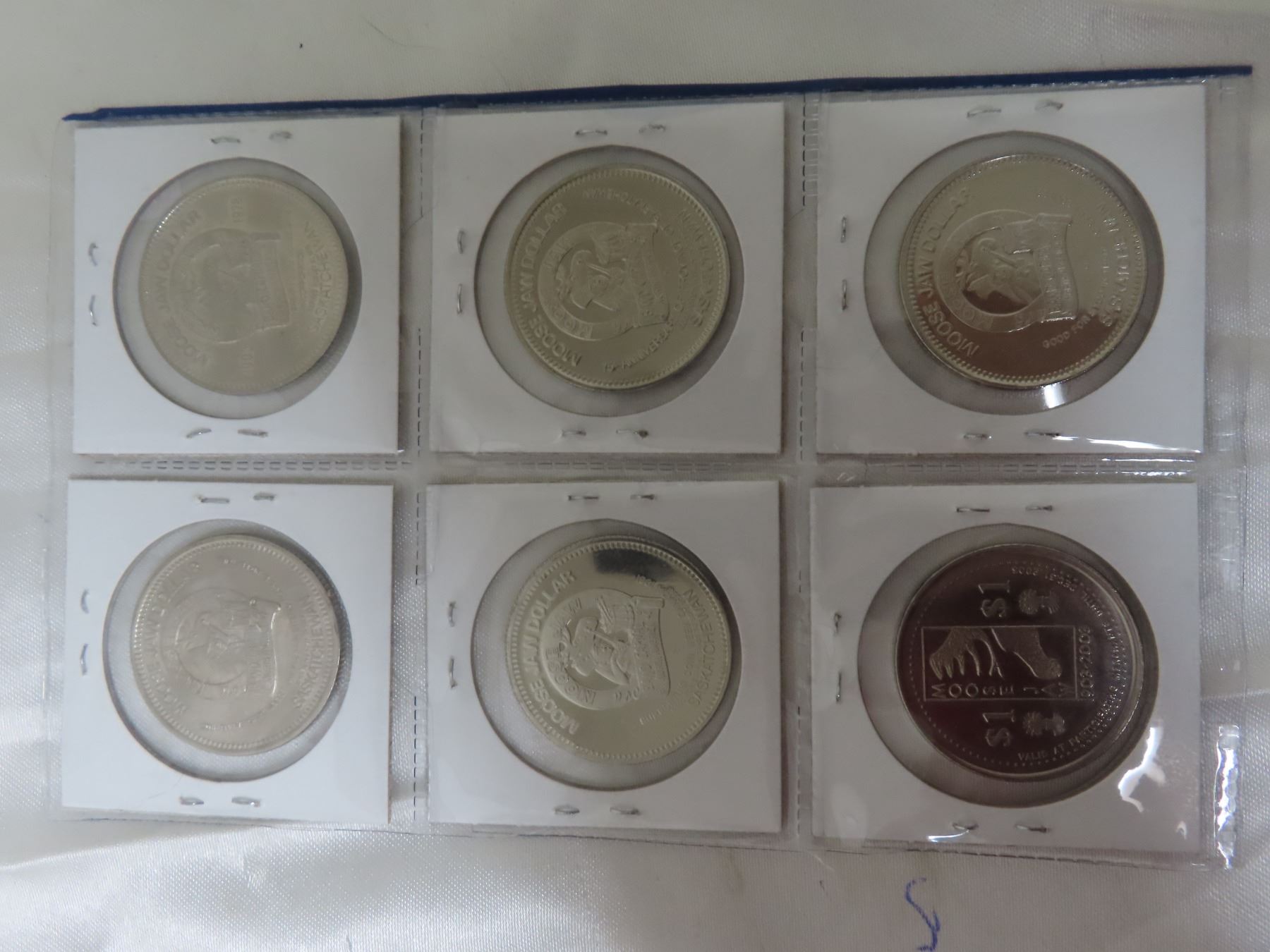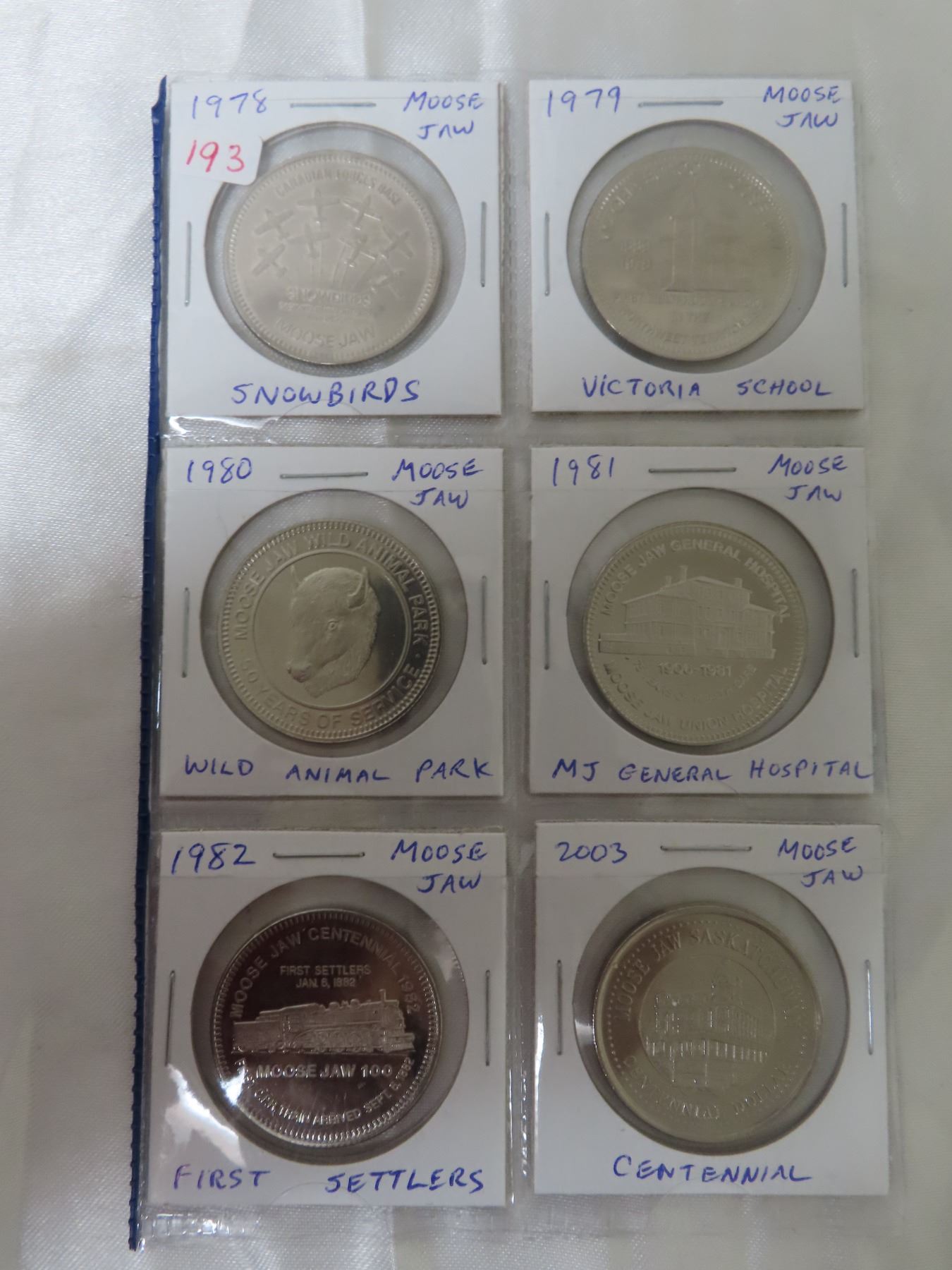 Lot of 6 Moose Jaw Trade Dollars. Includes Snowbirds, Victoria School, Wild Animal Park, MJ General Hospital, First Settlers & MJ Centennial. BU.