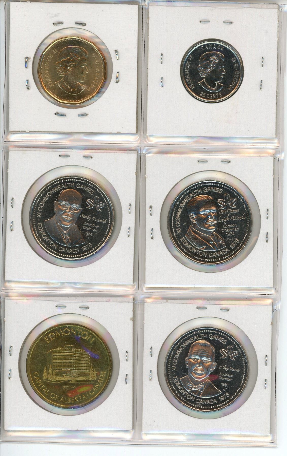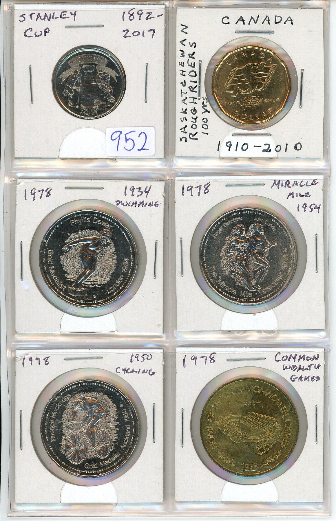 Lot of 6 Sports coins, medals & trade dollars. Includes Stanley Cup, Saskatchewan Roughriders, swimming, track & field, cycling & Commonwealth Games.