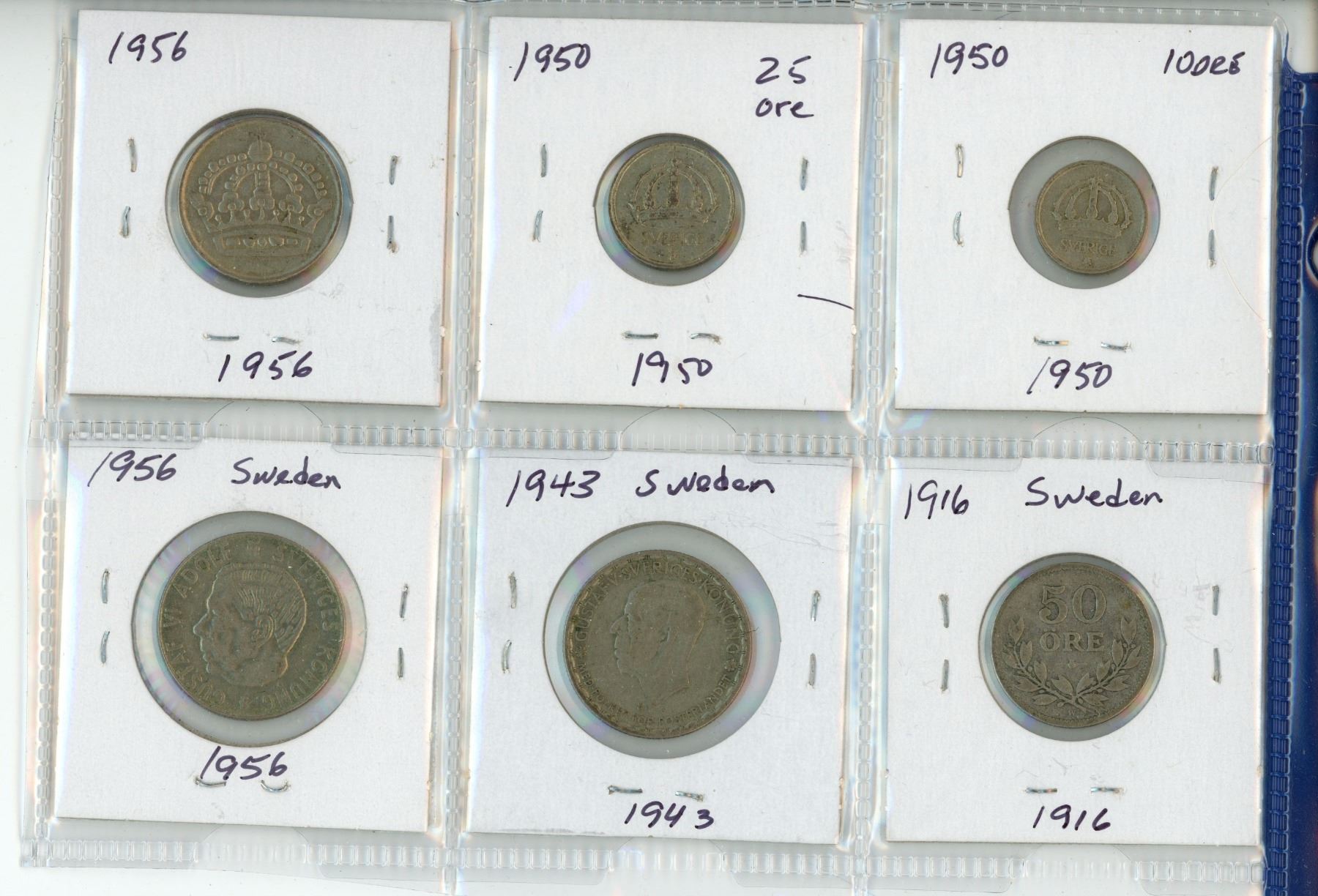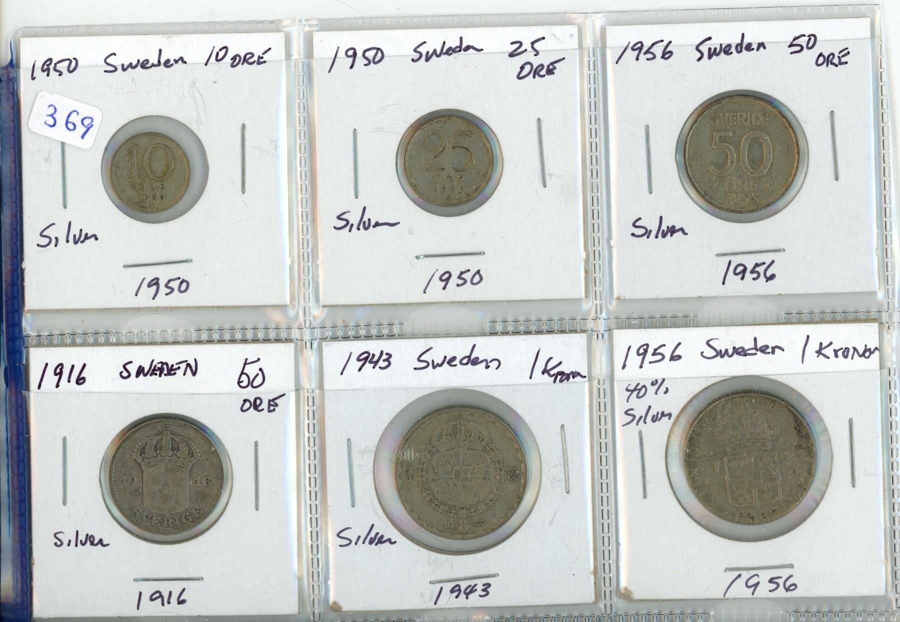 Lot of 6 Sweden Silver Coins: 1916 50 Ore, 1943 1 Kroner, 1950 10 & 25 Ore, 1956 50 Ore & 1 Kroner