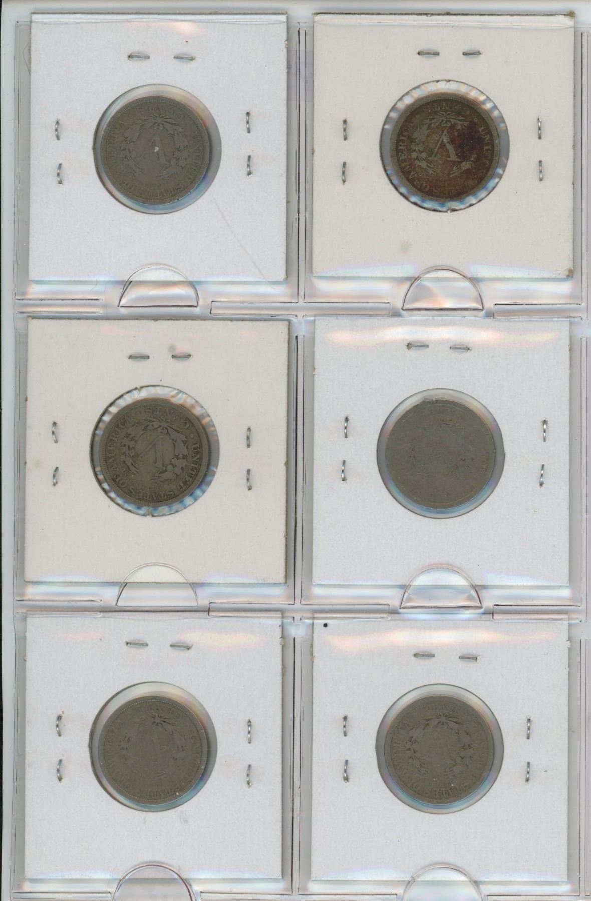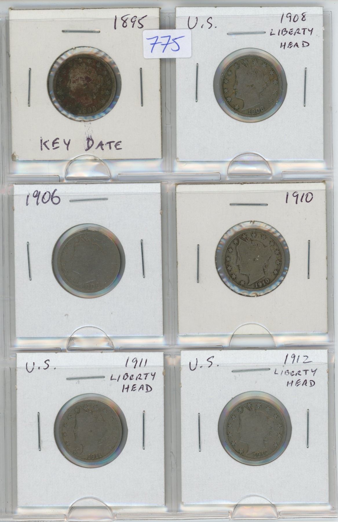 Lot of 6 U.S. Liberty Head 5 Cents. Includes 1895 Key Date, 1906, 1908, 1910, 1911 & 1912. Coins grade Good.