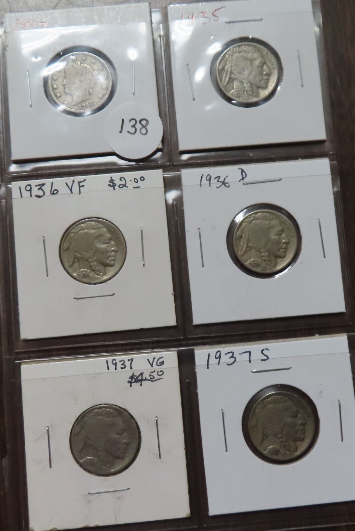 Lot of 6 U.S. Liberty Head & Buffalo Nickels. Includes 1912, 1935, 1936, 1936D, 1937 & 1937S.