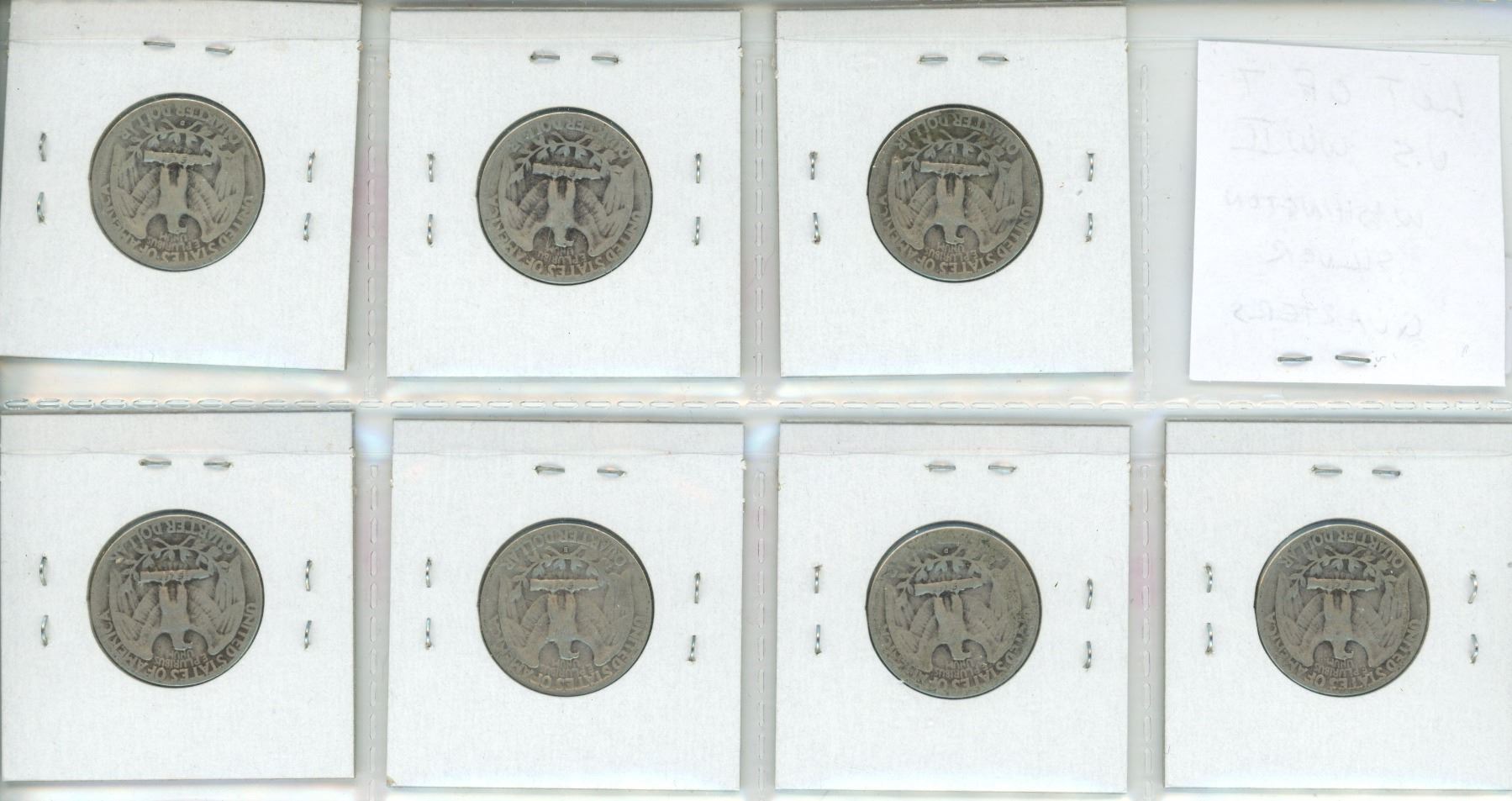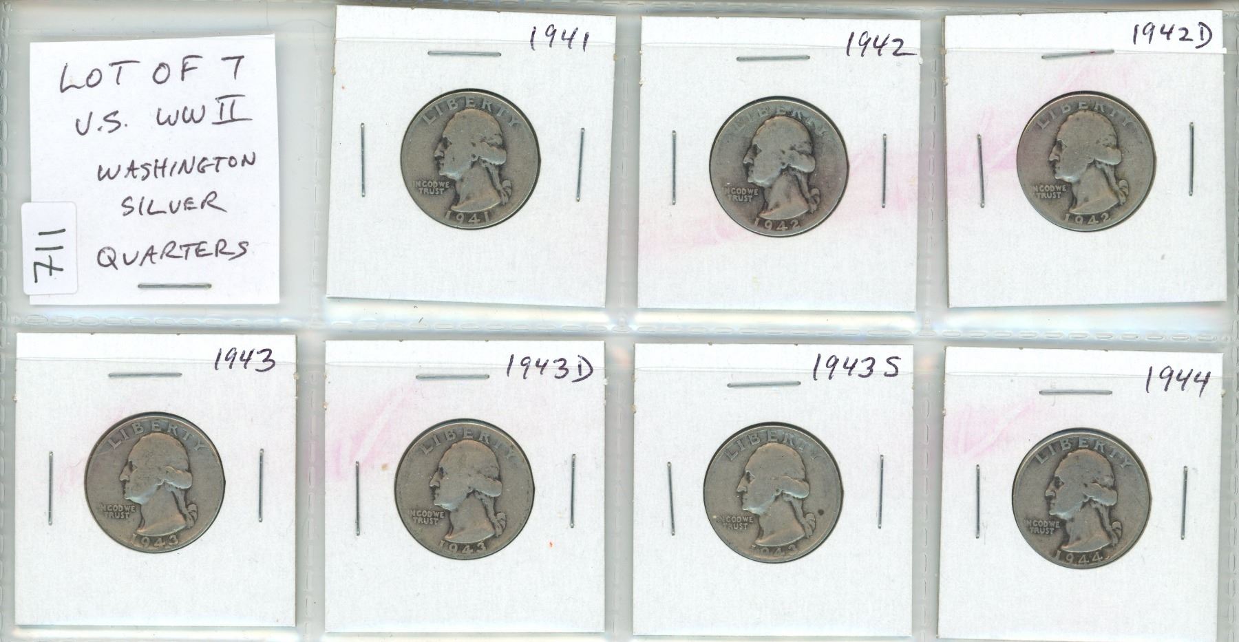 Lot of 7 U.S. World War II Silver Washington Quarters. Includes 1941, 1942, 1942D, 1943, 1943D, 1943