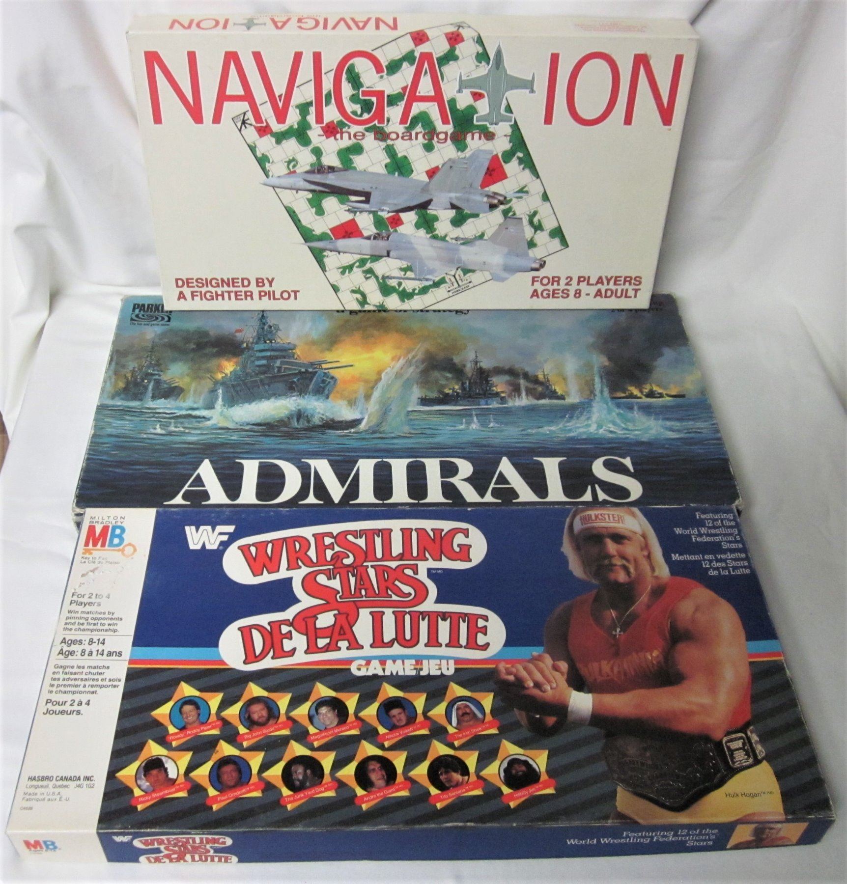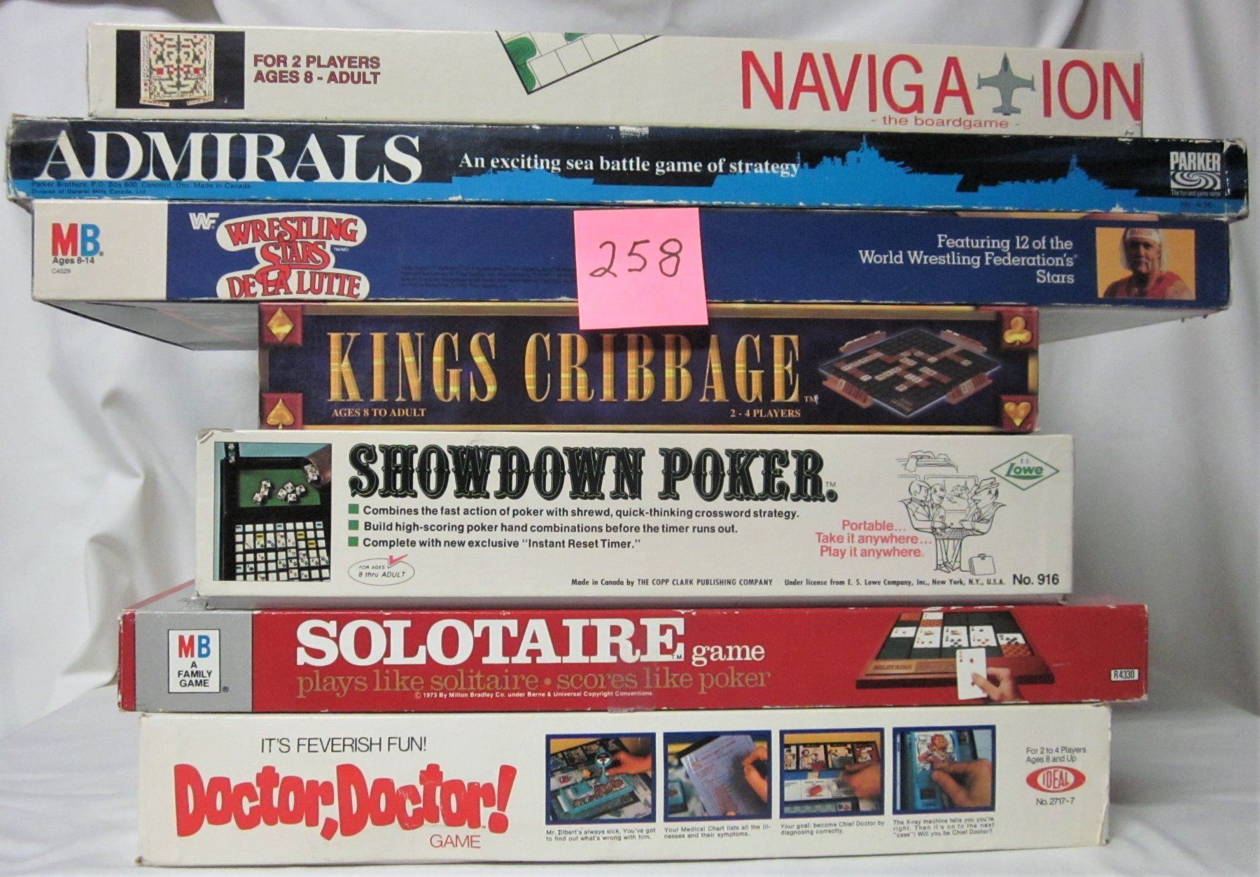 Lot of 7 boardgames (1971 Showdown Poker, 1972 Admirals, 1973 Solitaire, 1978 Doctor-Doctor, 1985 WWF wrestling stars, 1989 Navigation, 2007 King's cribbage)