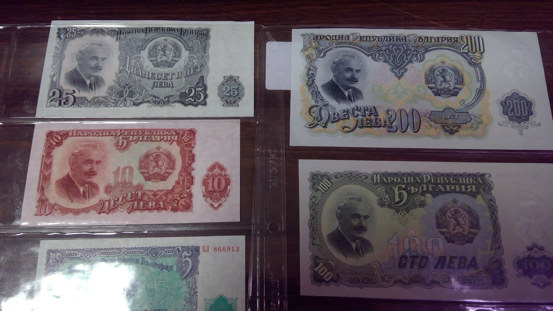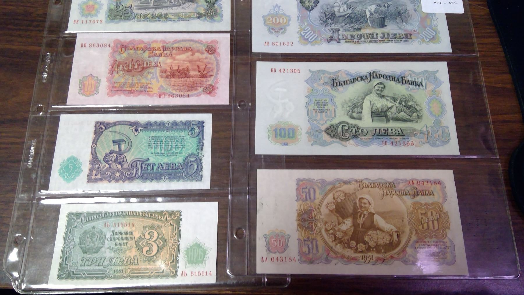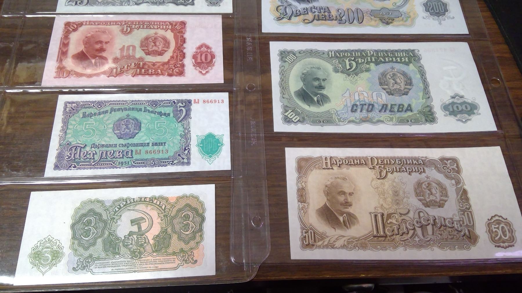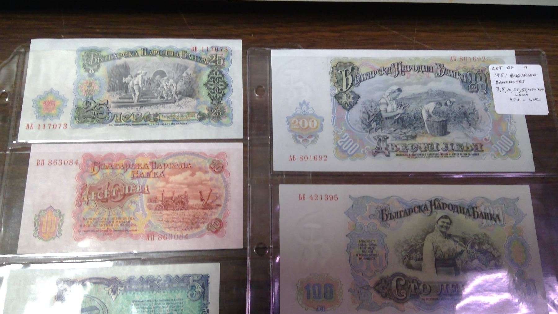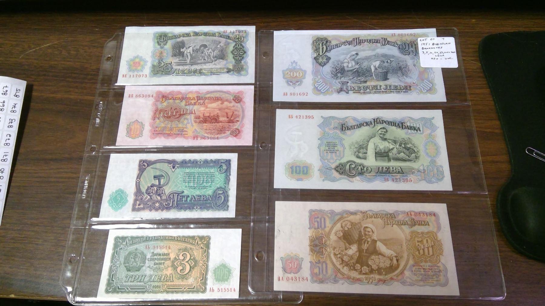 Lot of 7 different Bulgarian 1951 notes: 3, 5, 10, 25, 50, 100 & 200 Leva. VF – Unc.