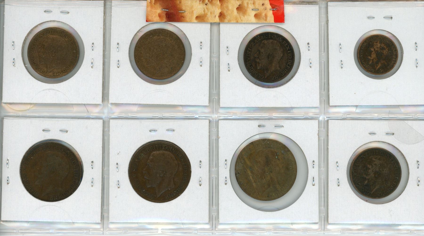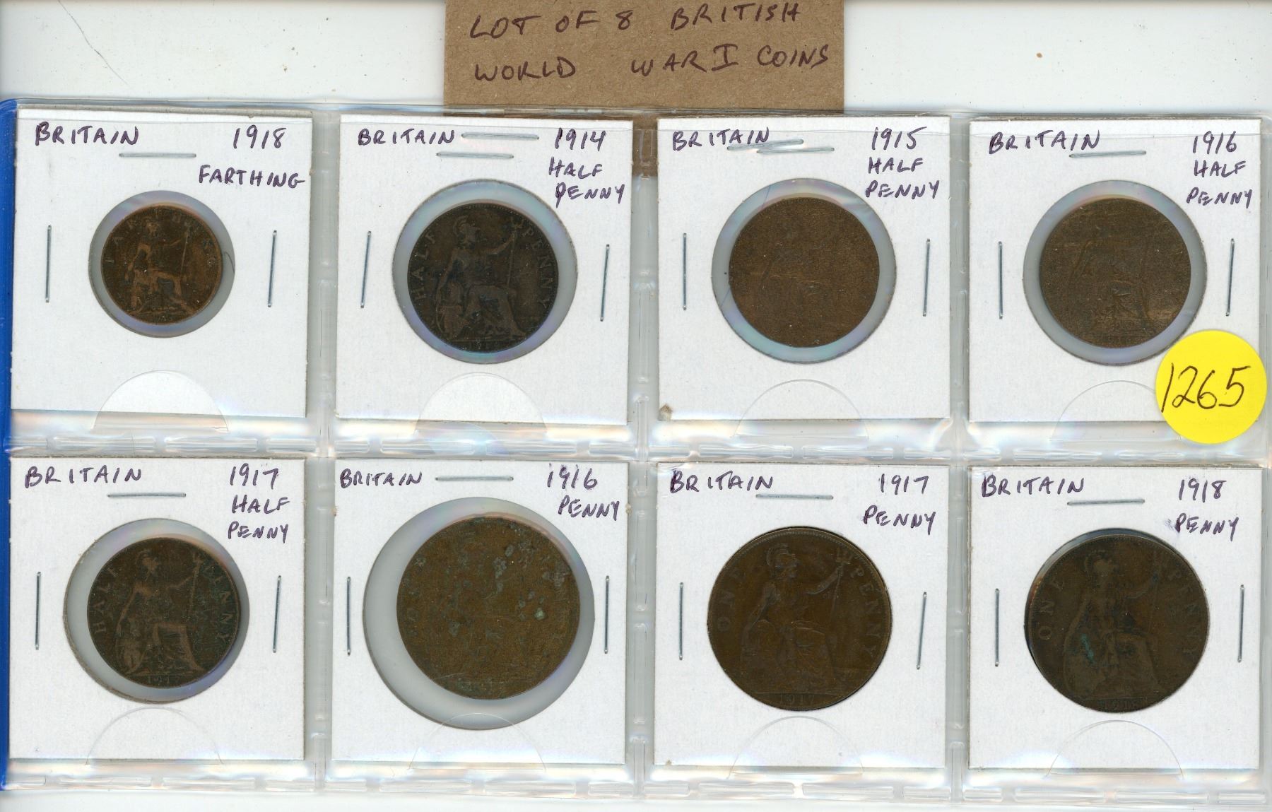 Lot of 8 British World War I Coins. 1918 Farthing, 1914, 1915, 1916 & 1917 Half Pennies, 1916, 1917