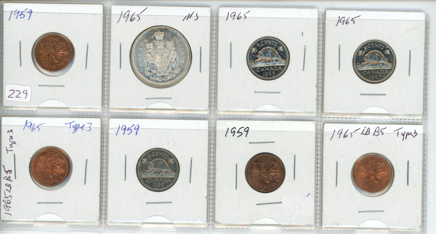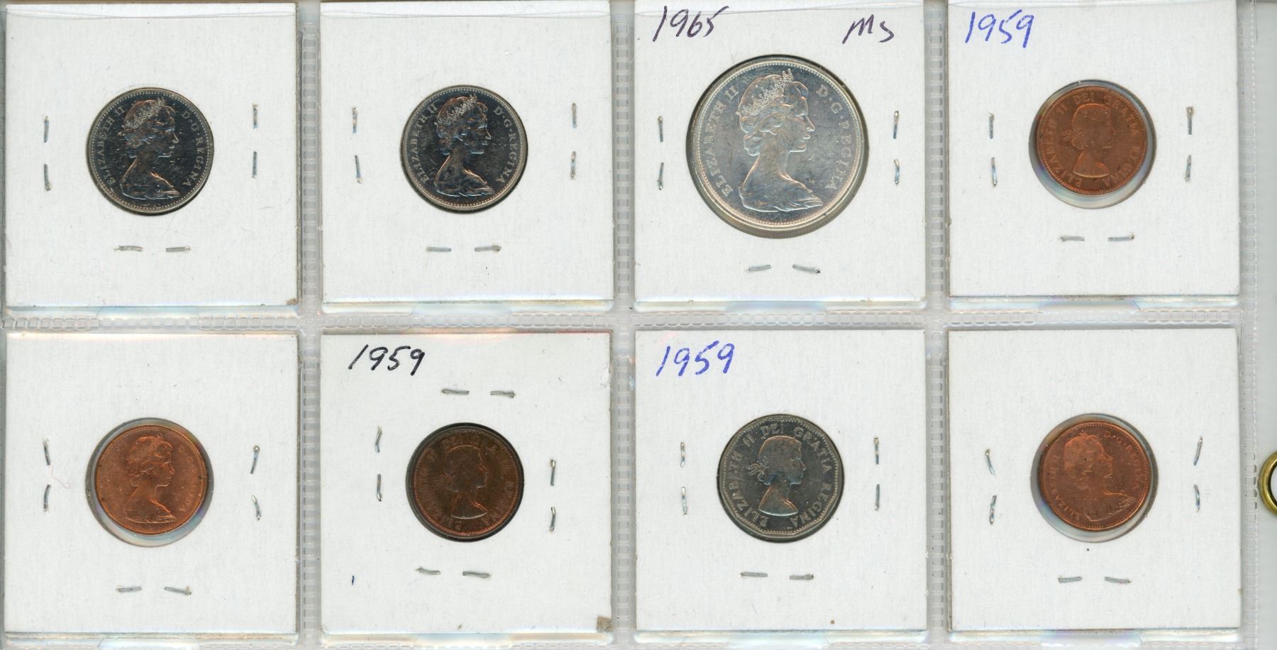 Lot of 8 Canada coins: 1¢ (1959 x 2, 1965 Type 3 x 2), 5 ¢ (1959, 1965 x2), 50¢ (1965)