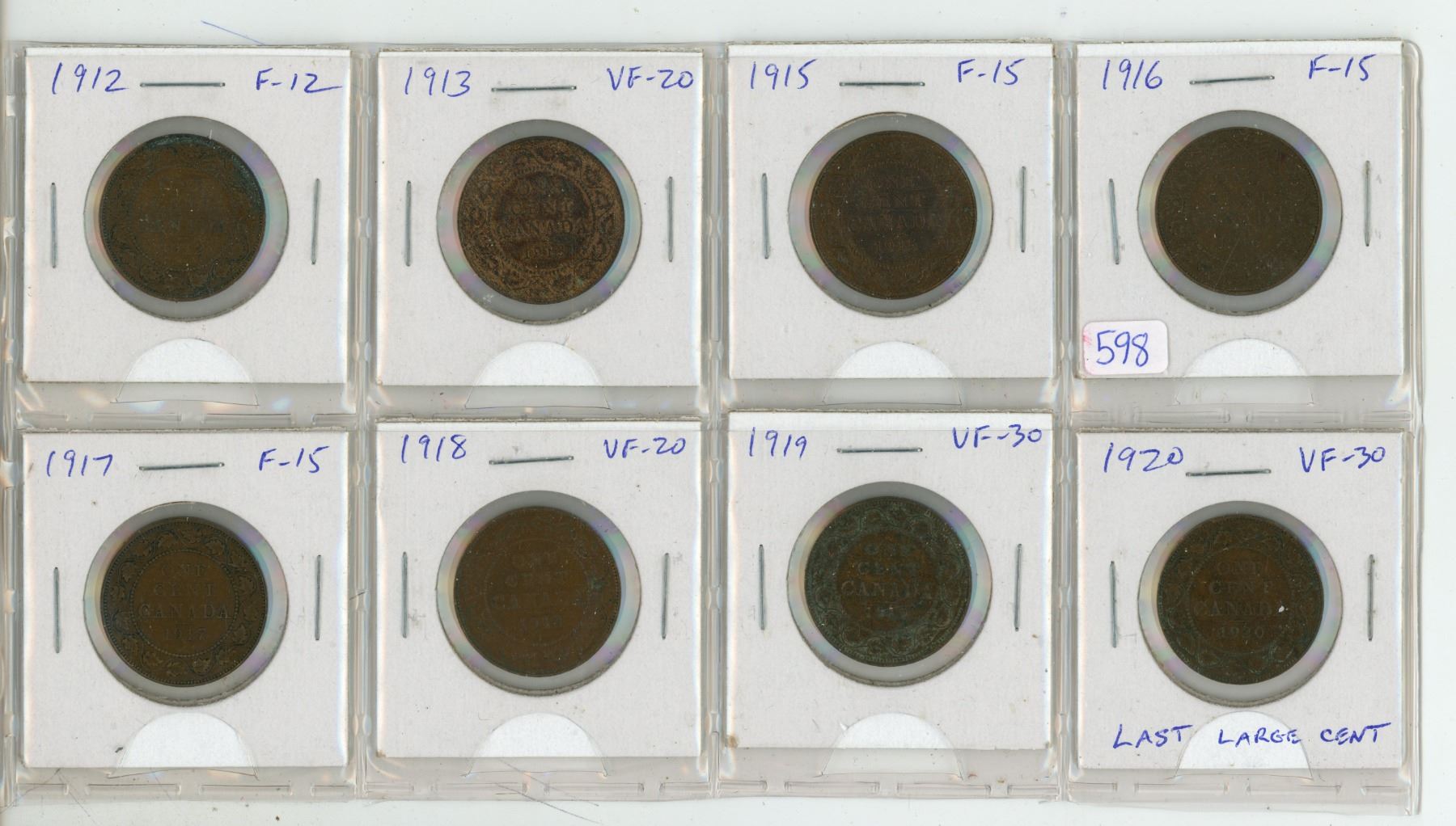 Lot of 8 Canadian George V Large Cents. Includes 1912, 1913, 1915, 1916, 1917, 1918, 1919 & 1920. Coins grade F-12 to VF-30.