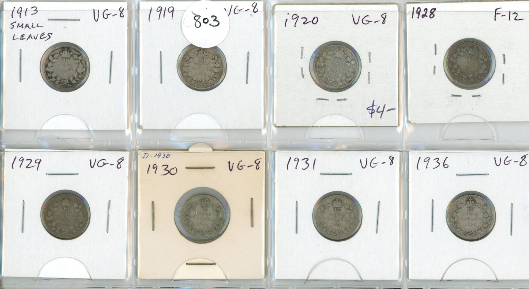 Lot of 8 Canadian George V Silver 10 Cents. Includes 1913 Small Leaves, 1919, 1920, 1928, 1929, 1930, 1931 & 1936. Coins grade VG-8 to F-12.