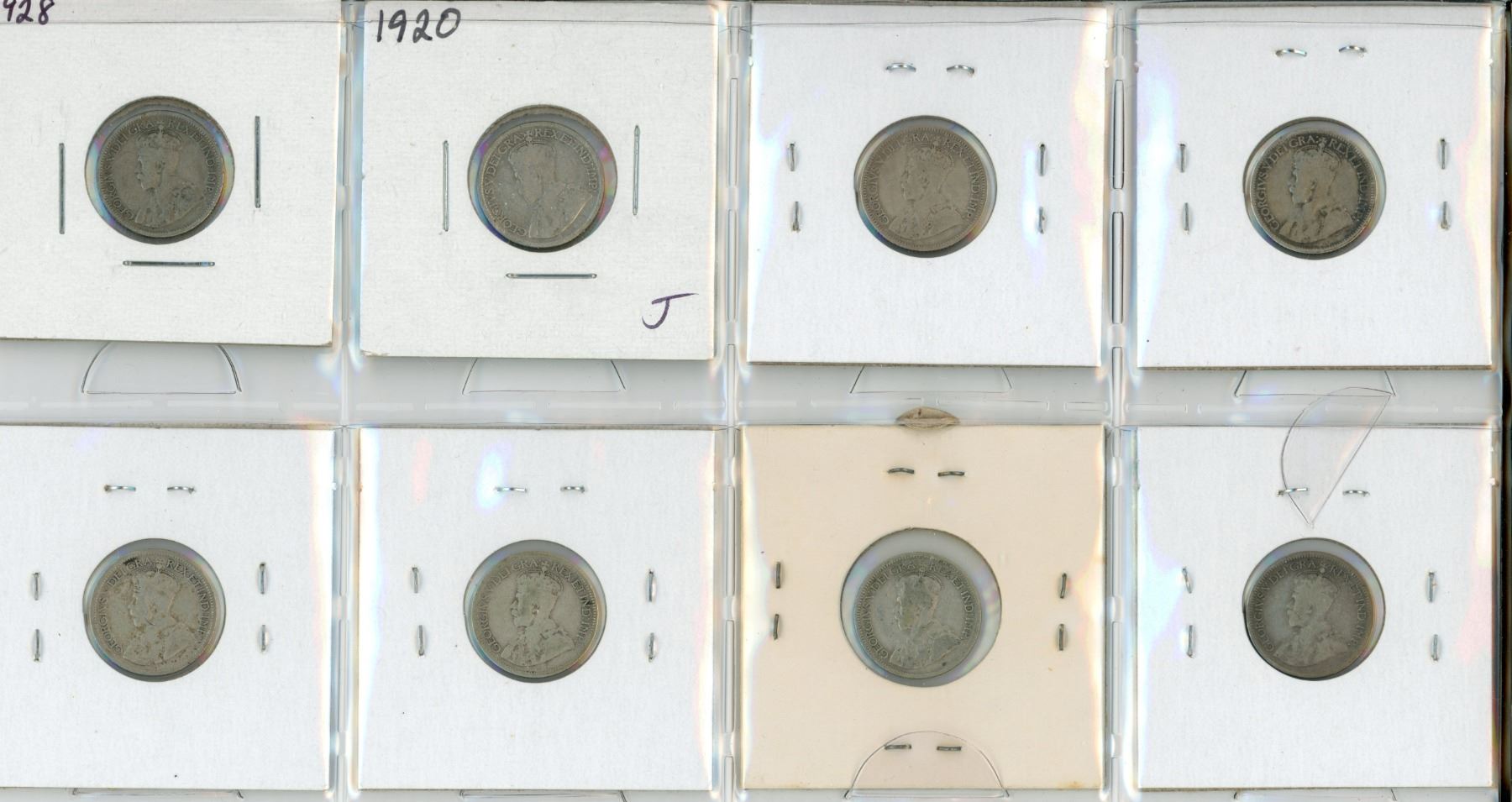 Lot of 8 Canadian George V Silver 10 Cents. Includes 1913 Small Leaves, 1919, 1920, 1928, 1929, 1930