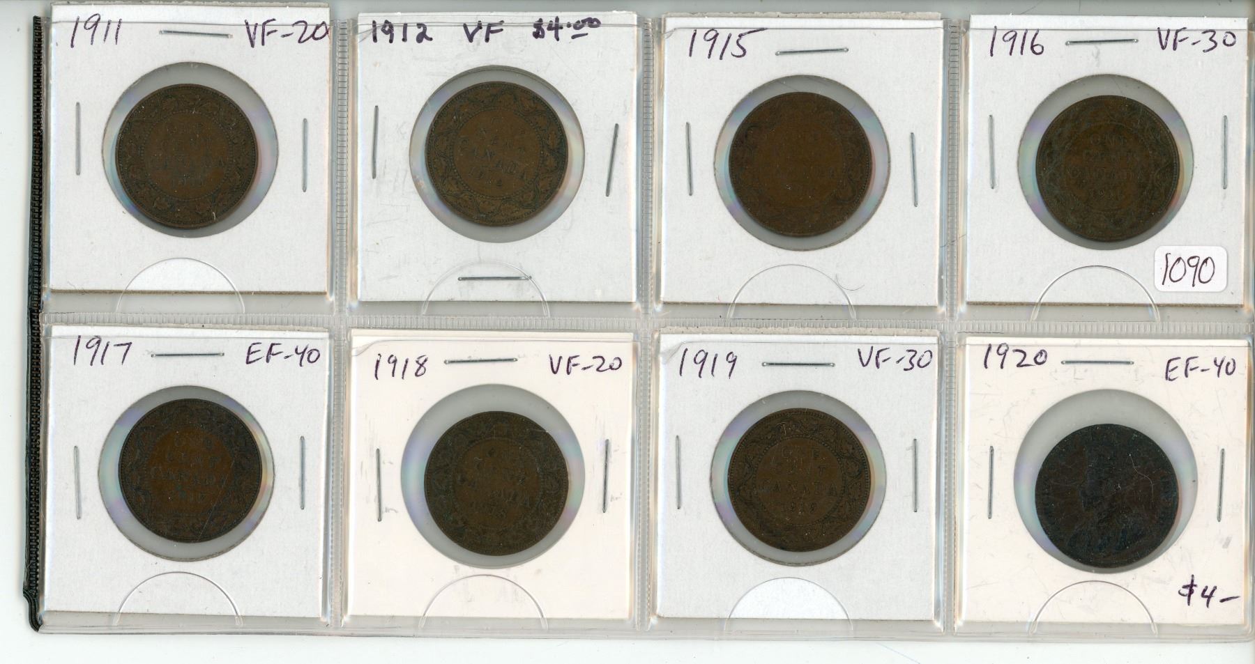 Lot of 8 Canadian King George V Large Cents. Includes 1911, 1912, 1915, 1916, 1917, 1918, 1919 & 1920. Coins grade F-12 to EF-40.