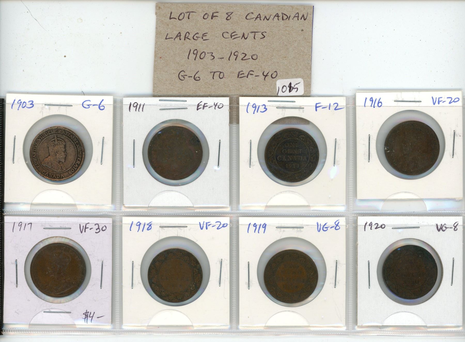 Lot of 8 Canadian Large Cents 1903 – 1920. Includes 1903, 1911, 1913, 1916, 1917, 1918, 1919, 1920. Coins grade G-6 to EF-40.