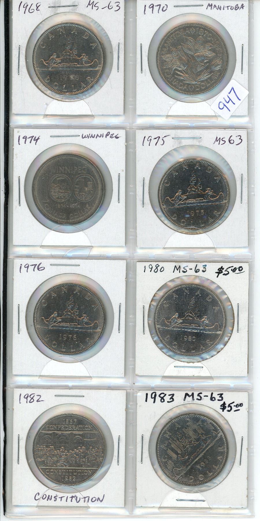 Lot of 8 Canadian Nickel Dollars dated 1968 to 1983. Various grades including MS-63.