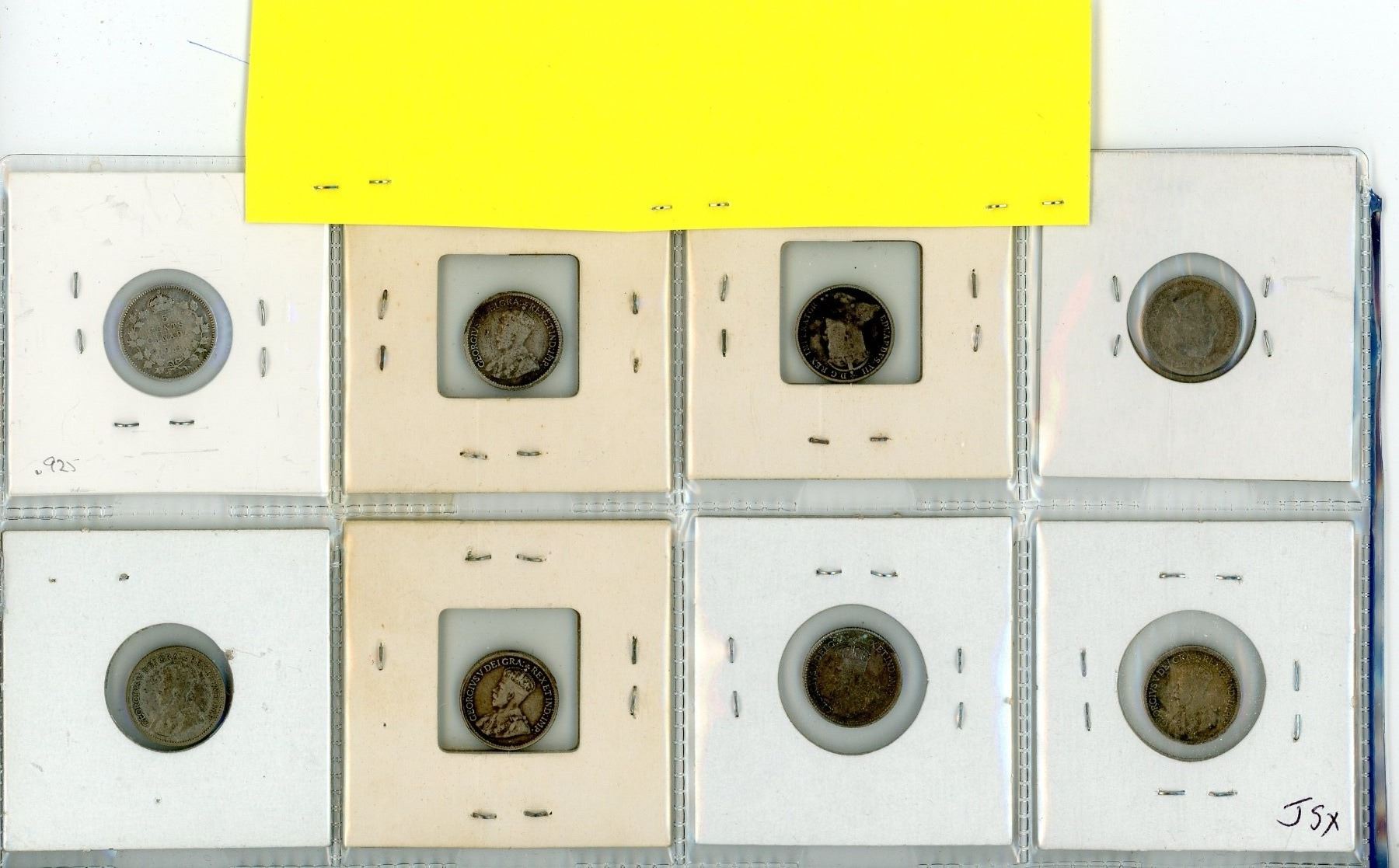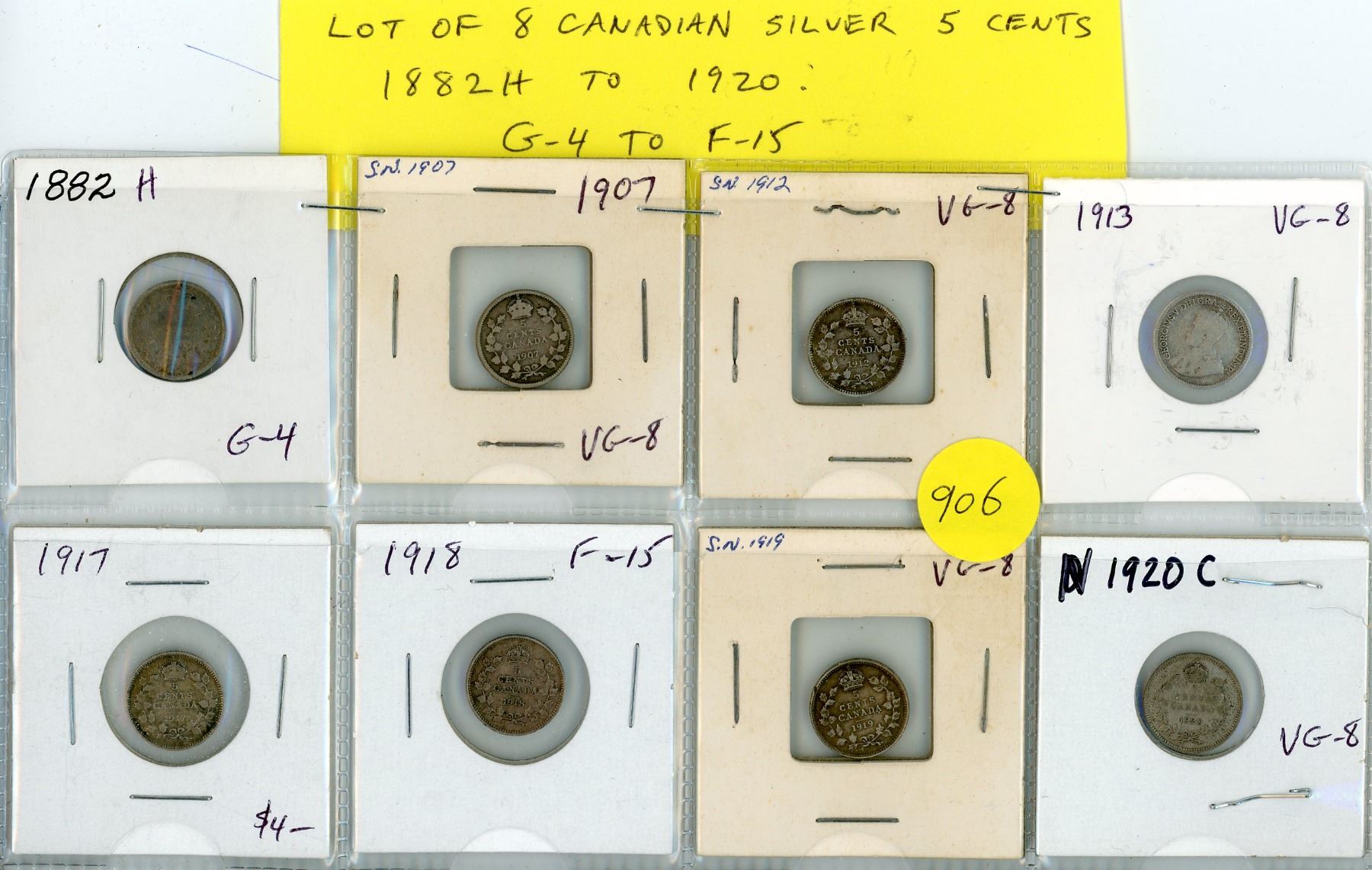 Lot of 8 Canadian Silver 5 Cents 1882H to 1920. Includes 1882H, 1907, 1912, 1913, 1917, 1918, 1919, 1920. Coins grade G-4 to F-15.
