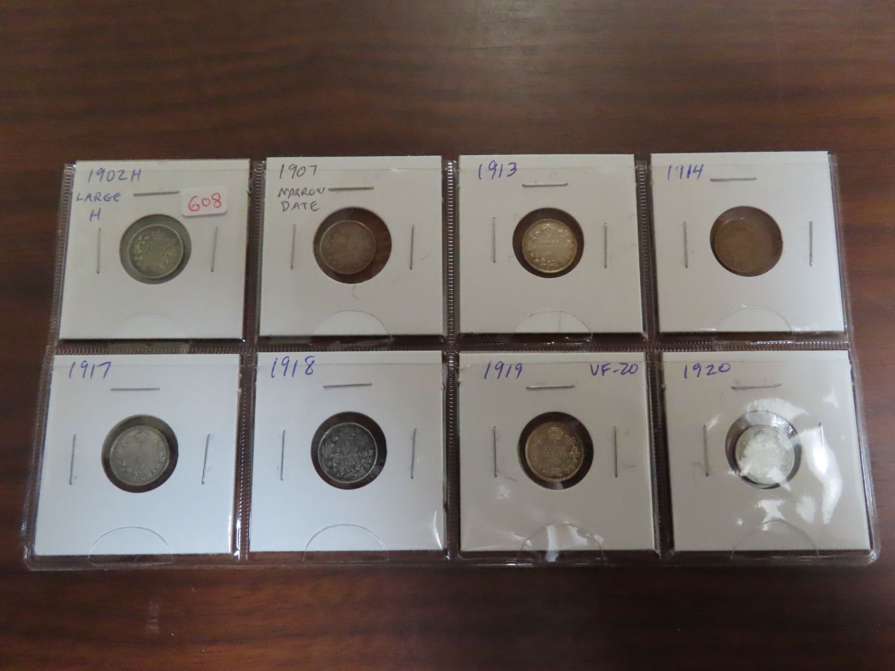 Lot of 8 Canadian Silver 5 Cents. Includes 1902H Large H, 1907 Narrow Date, 1913, 1914, 1917, 1918, 1919 & 1920. Coins grade up to VF-20.