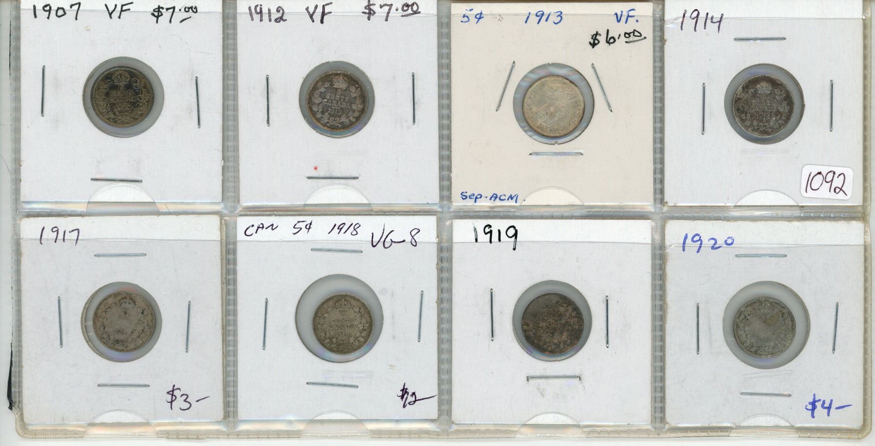 Lot of 8 Canadian Silver 5 Cents. Includes 1907, 1912, 1913, 1914, 1917, 1918, 1919 & 1920. Coins grade VG-8 to VF-20.