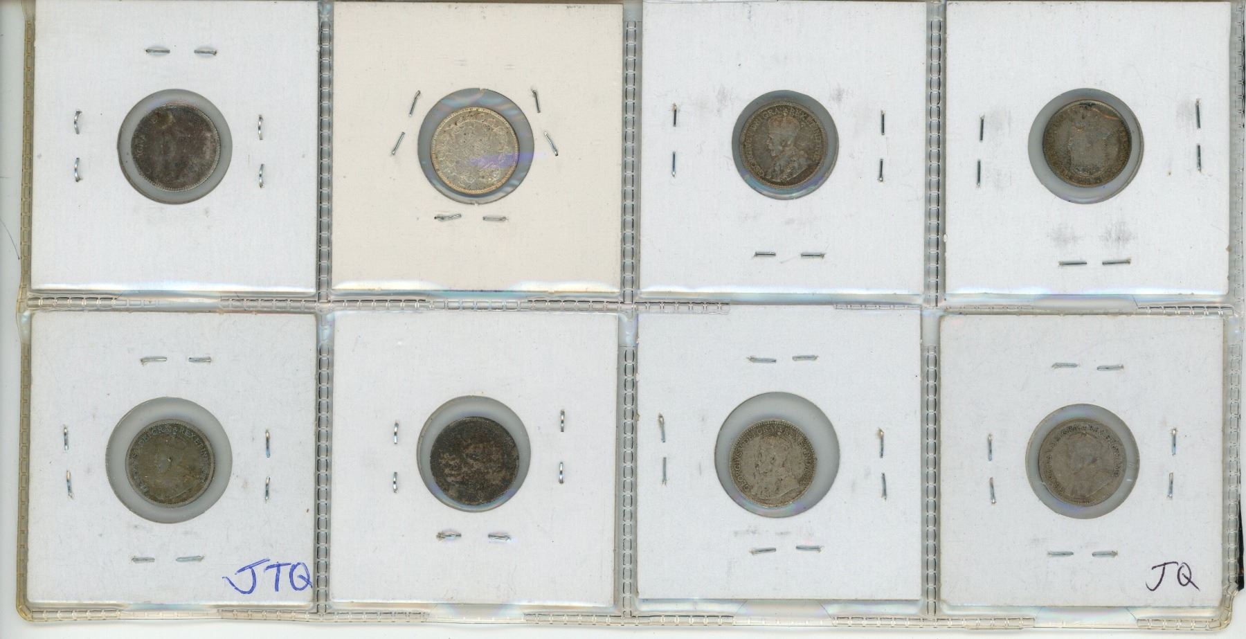 Lot of 8 Canadian Silver 5 Cents. Includes 1907, 1912, 1913, 1914, 1917, 1918, 1919 & 1920. Coins gr