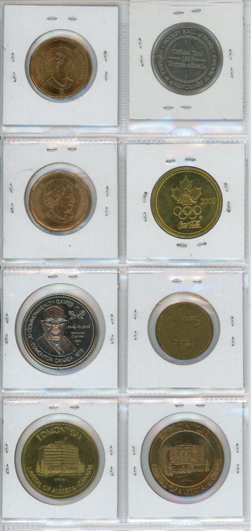 Lot of 8 Canadian Sports Medals, Coins & Trade Dollars. Includes 1972 Canada-Russia Hockey Series, Montreal Canadiens Loonie, Joe Sakic Hockey, Sask. Roughriders Loonie, 1995 Grey Cup & 3 more. A nice selection.