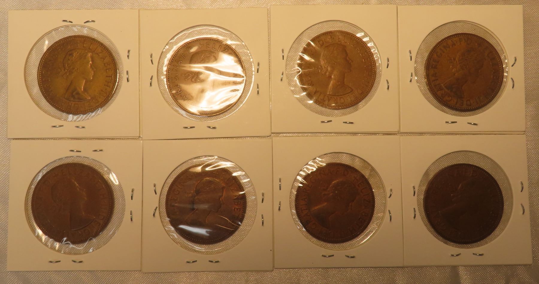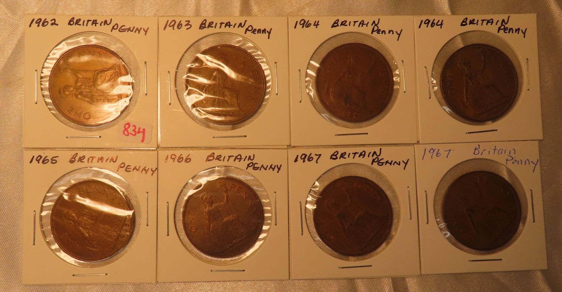 Lot of 8 Great Britian One Penny coins: 1962, 1963, 1964 (x2), 1965, 1966, 1967 (x2)