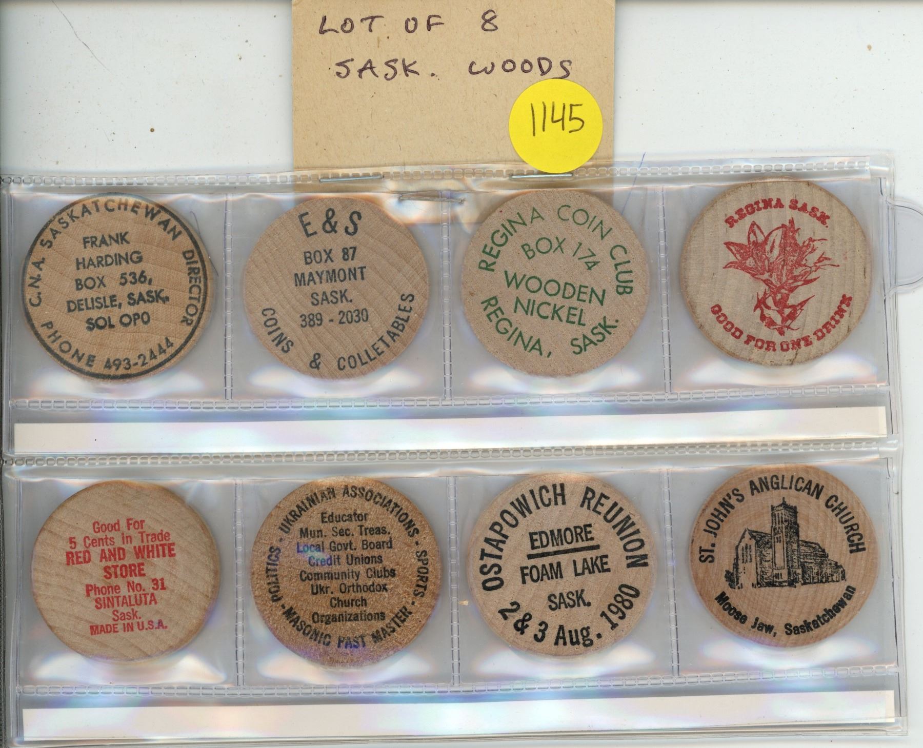 Lot of 8 Saskatchewan Woods. Includes Frank Harding, E & S Coins, Regina Coin Club, SaskTel Pioneers Good for 1 Drink, Red & White Sintaluta, Michael Swenarchuk, Ostapowich Reunion Foam Lake & St. John’s Anglican Church, Moose Jaw.
