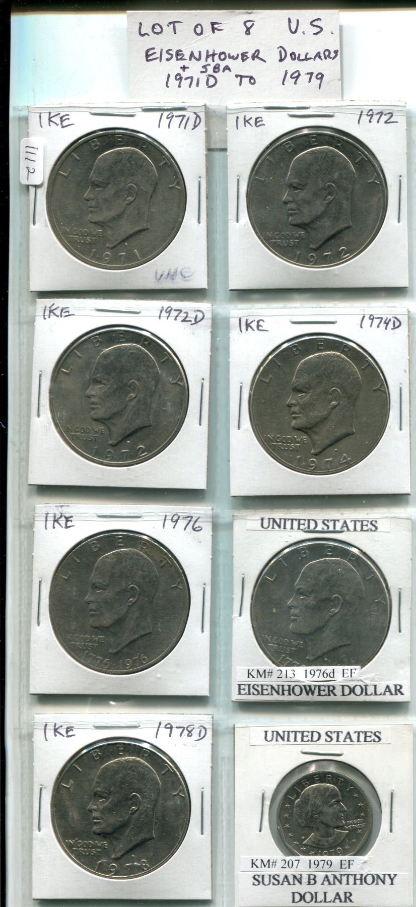 Lot of 8 U.S. Eisenhower & Susan B. Anthony Dollars. Includes 1971D, 1972, 1972D, 1974D, 1976, 1976D, 1978D & 1979. Coins grade EF to Uncirculated.