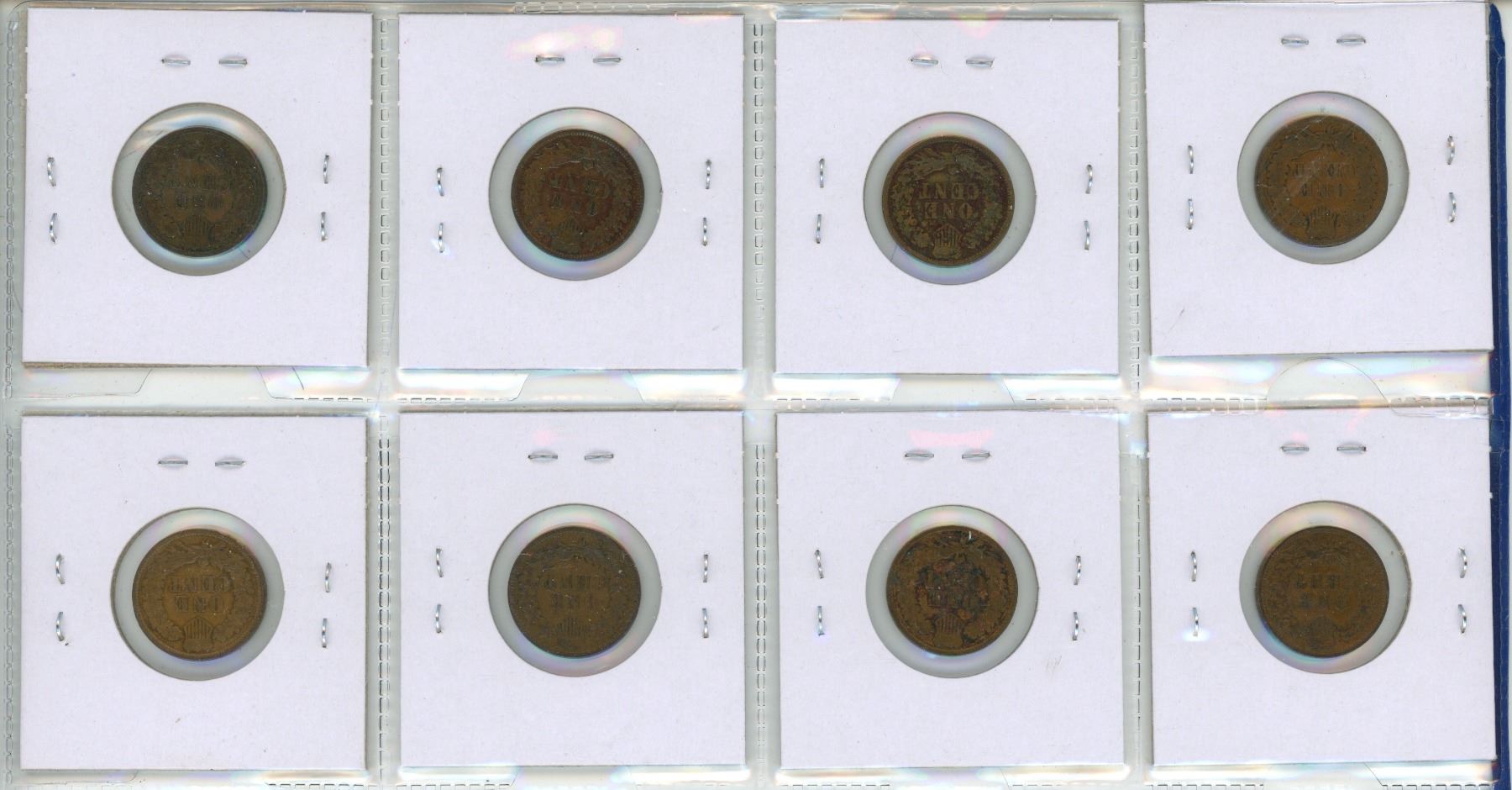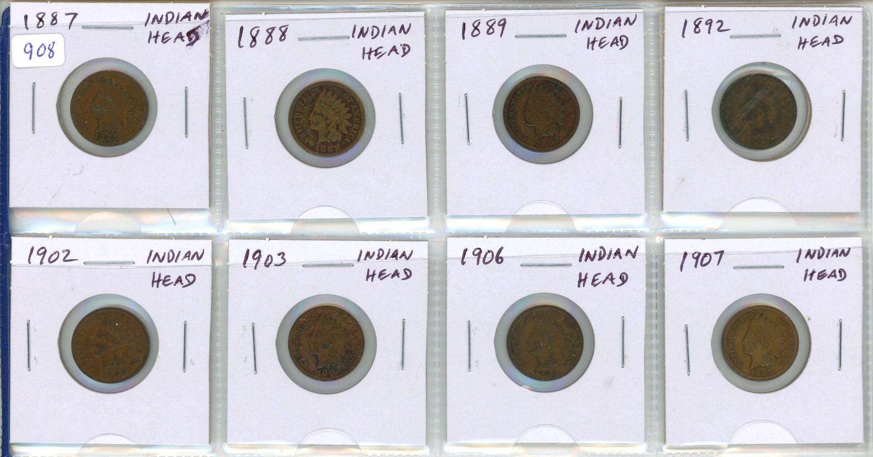 Lot of 8 U.S Indian Head Cents. Includes 1887, 1888, 1889, 1892, 1902, 1903. 1906 & 1907. Coins grade Good to VG.