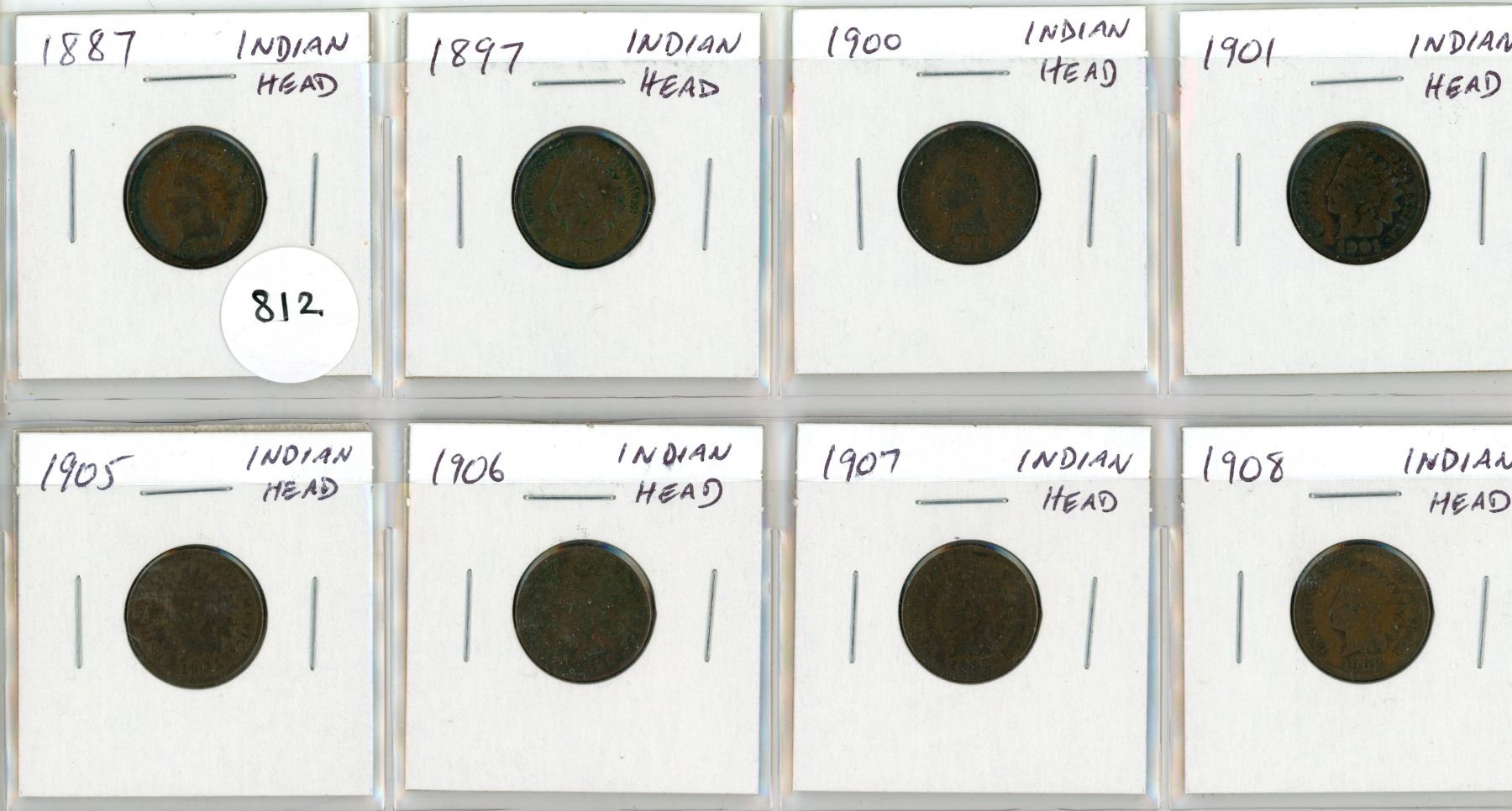 Lot of 8 U.S. Indian Head Cents. Includes 1887, 1897, 1900, 1901, 1905, 1906, 1907 & 1908.