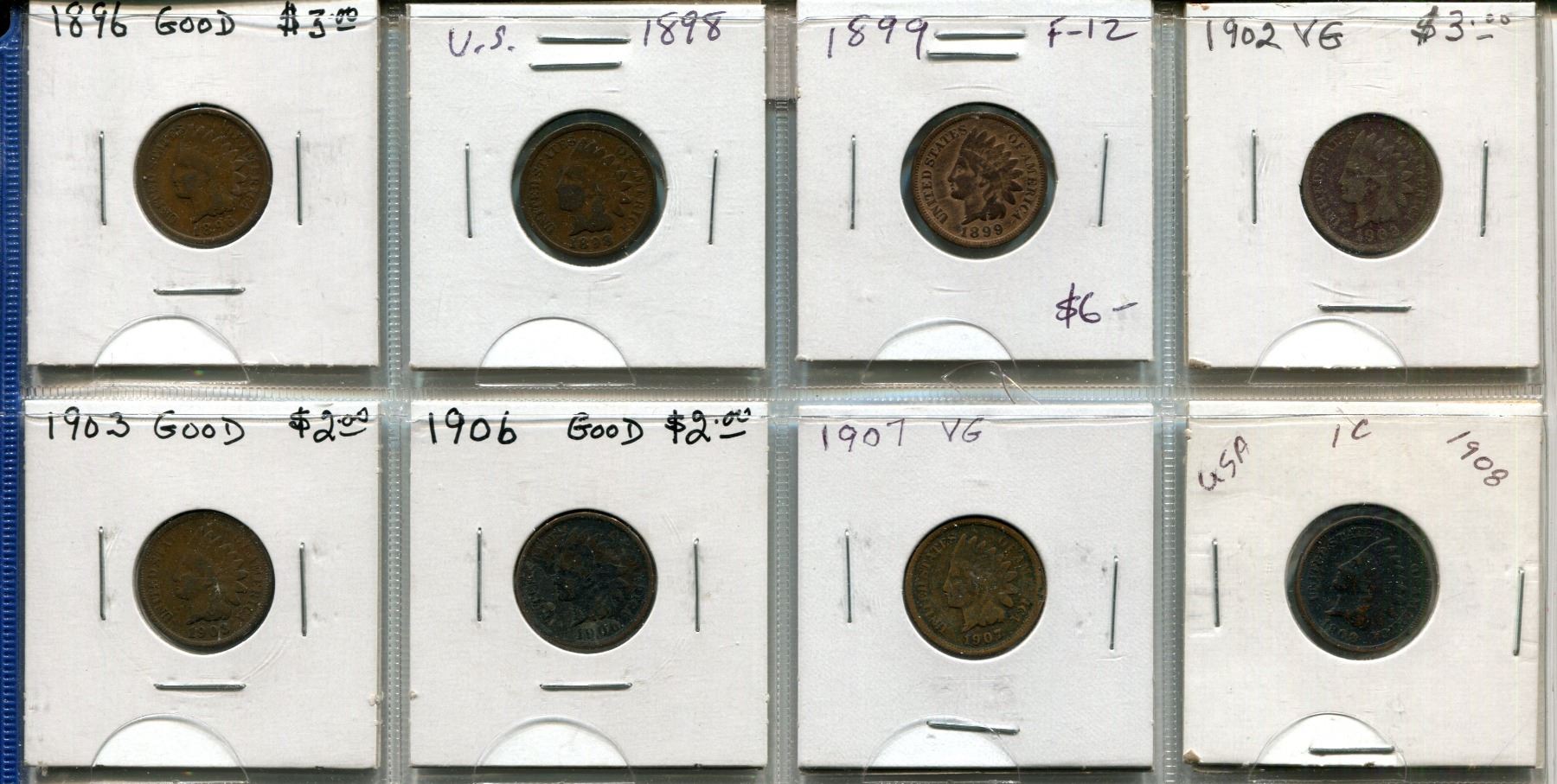 Lot of 8 U.S. Indian Head Small Cents 1896 – 1908. Includes 1896, 1898, 1899, 1902, 1903, 1906, 1907 & 1908. Coins grade Good to F-12.