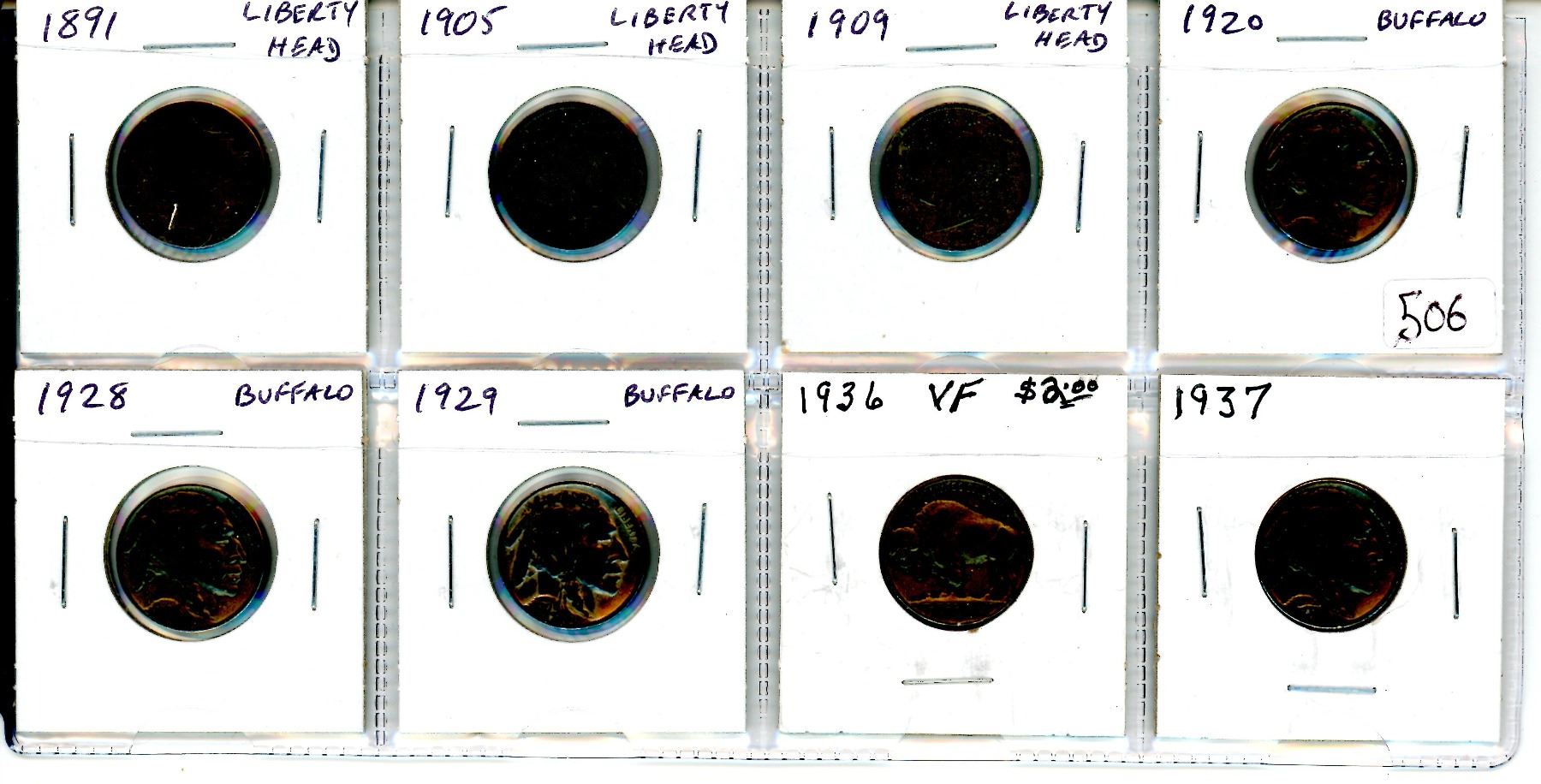 Lot of 8 U.S. Liberty Head & Buffalo Nickels. Includes 1891, 1905, 1909, 1920, 1928, 1929, 1936 & 1937.