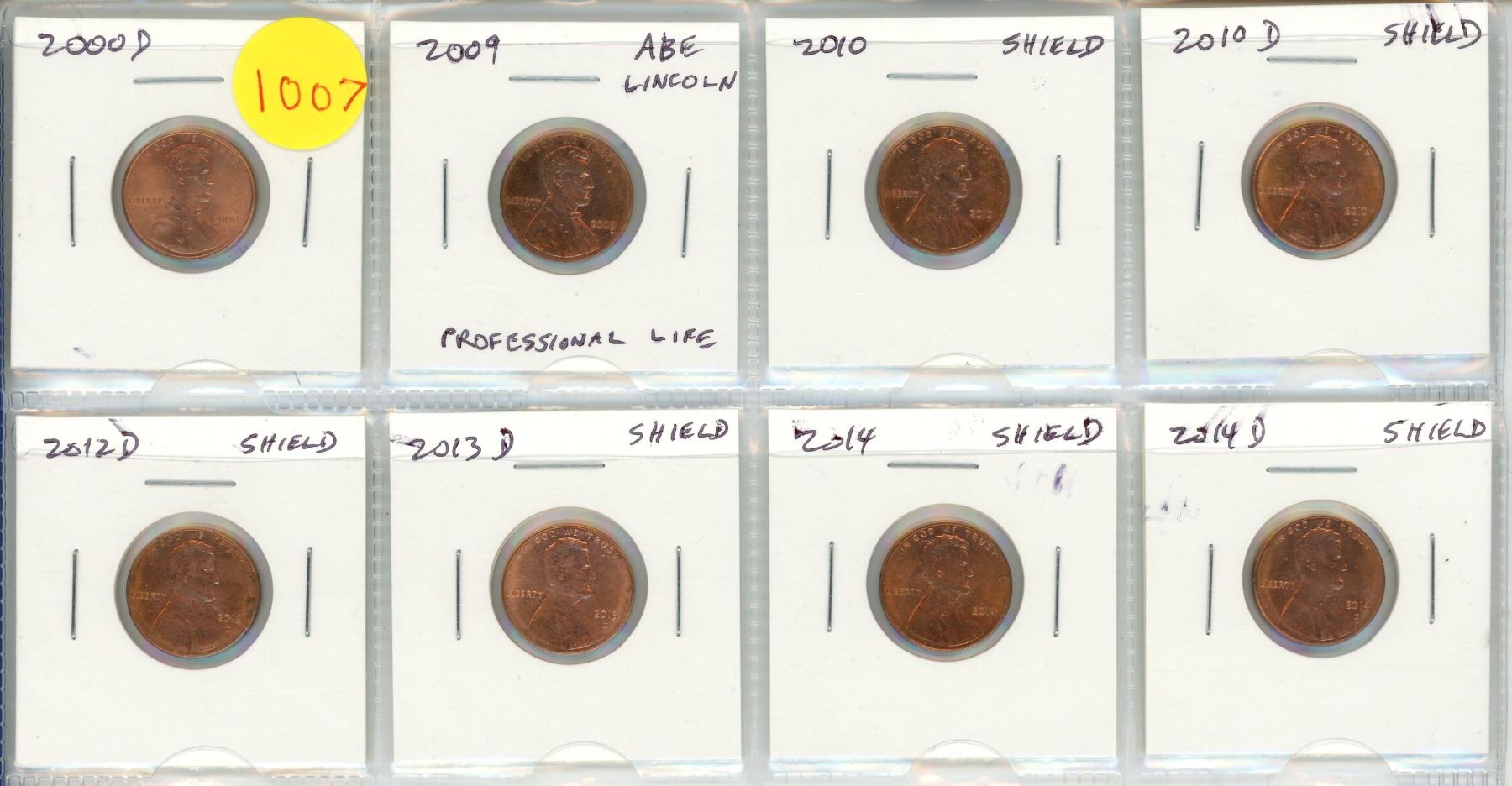 Lot of 8 U.S. Lincoln cents from 2000D to 2014D. BU Red.