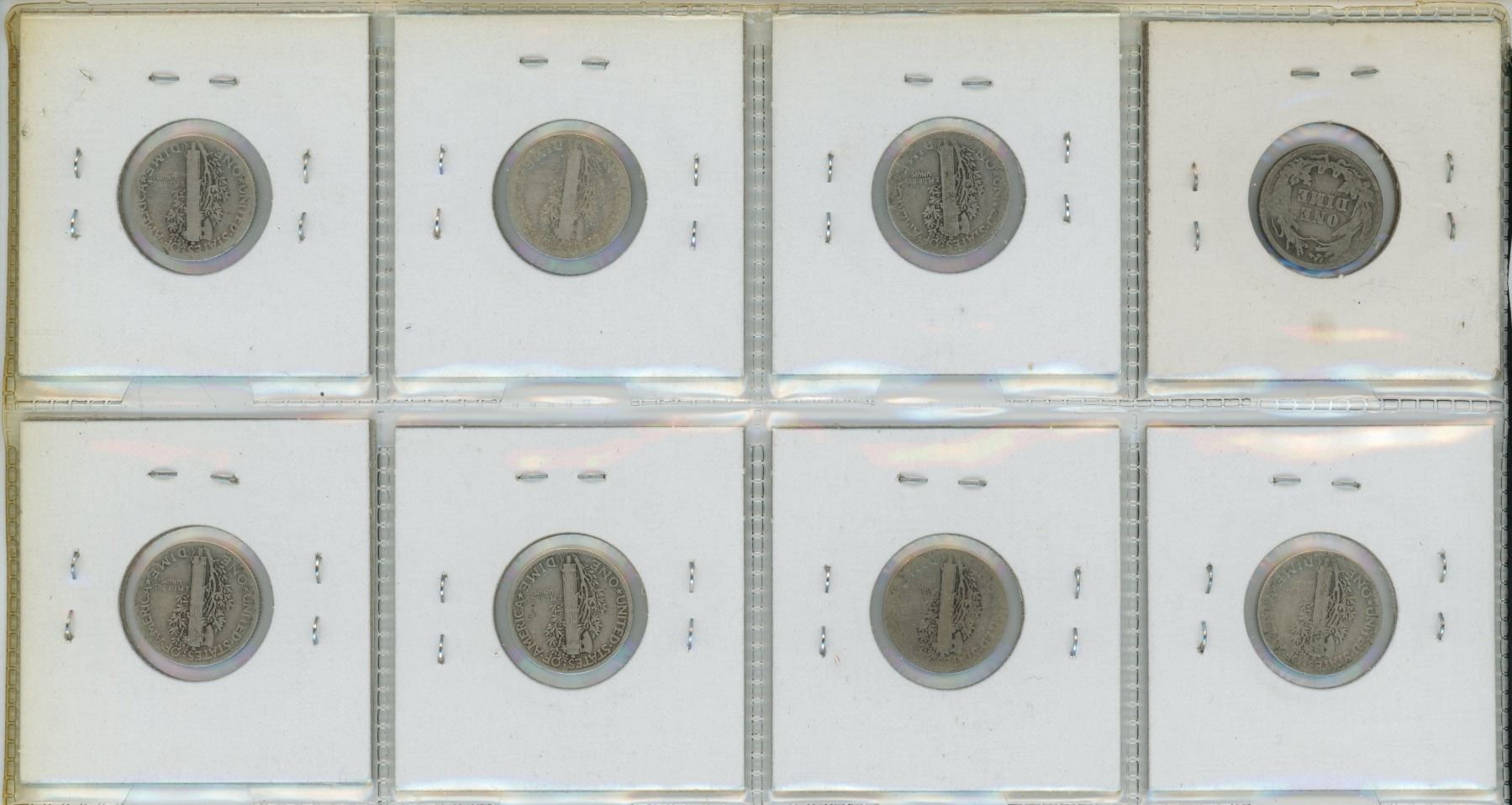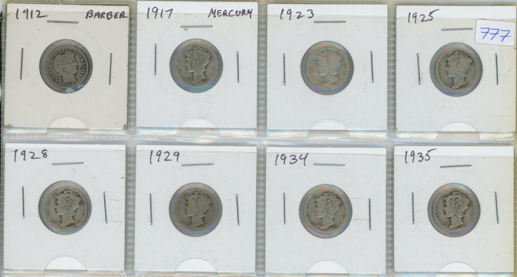 Lot of 8 U.S. Silver Barber & Mercury Dimes. Includes 1912, 1917, 1923, 1925, 1928, 1929, 1934 & 1935. Coins grade Good to F-15.